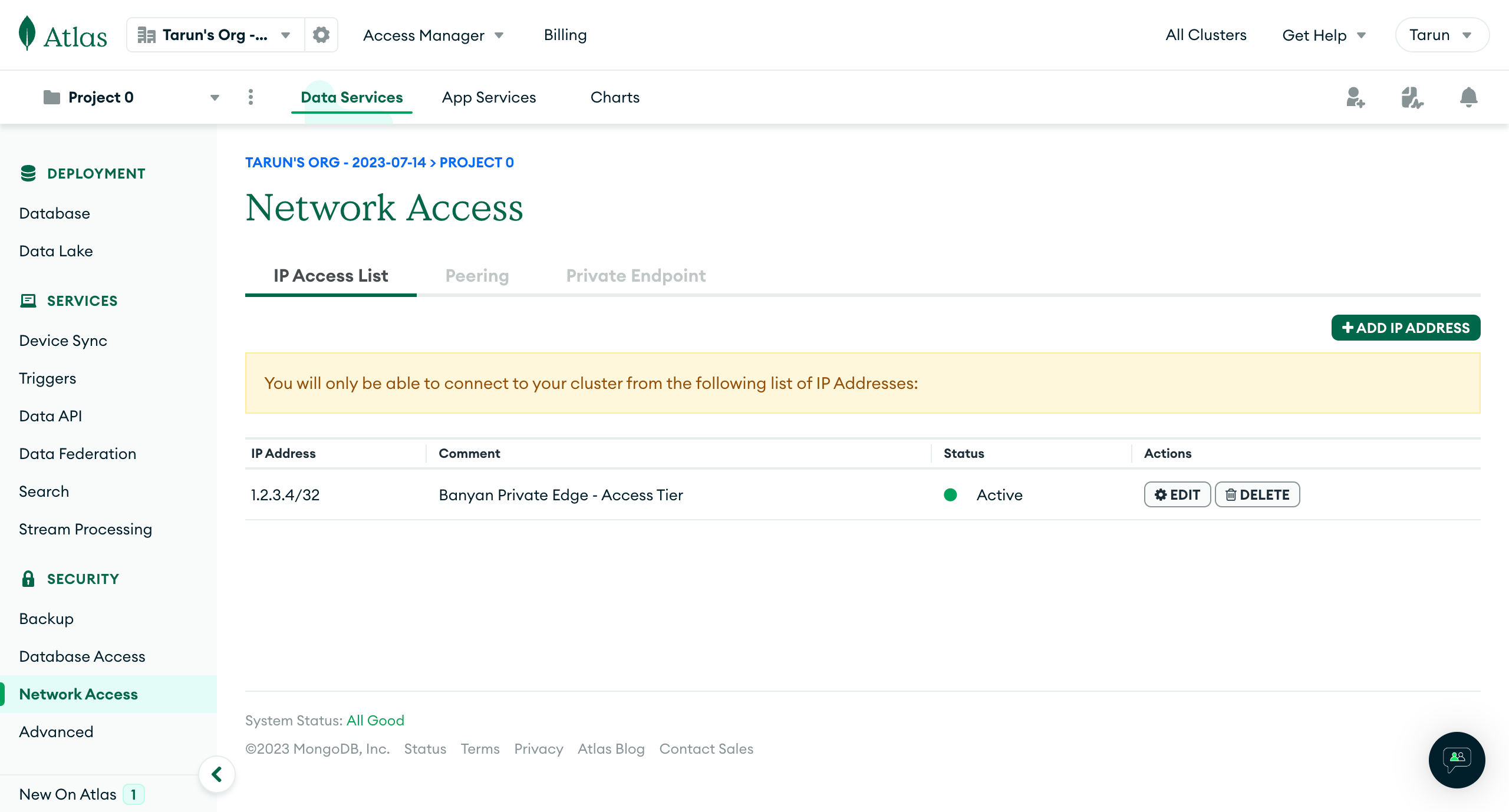 In Mongo Cloud, you can restrict access to specific IP ranges by updating the IP Access List setting.