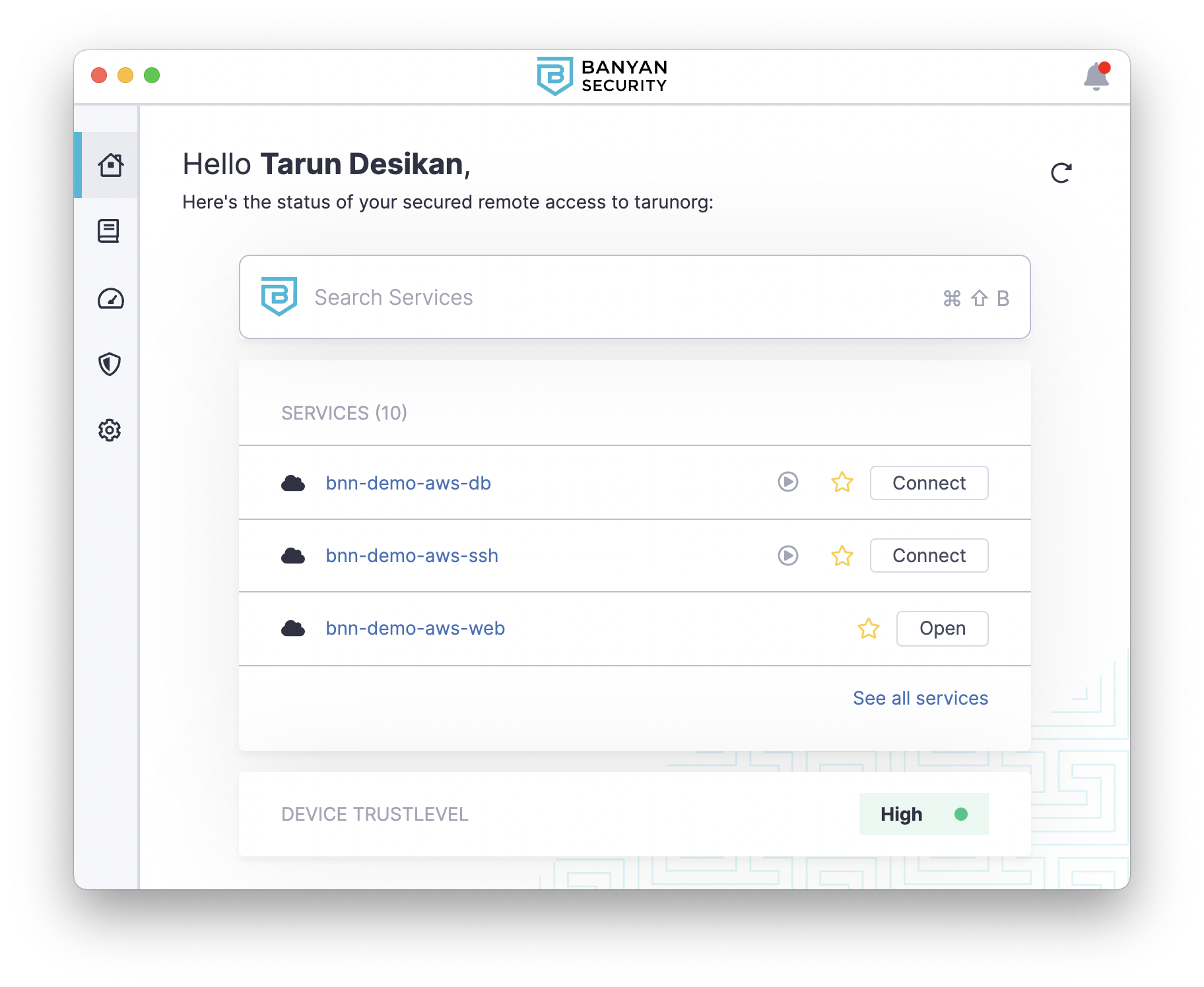 To access your AWS resources from your device, open the Banyan app and select a service to connect to it.