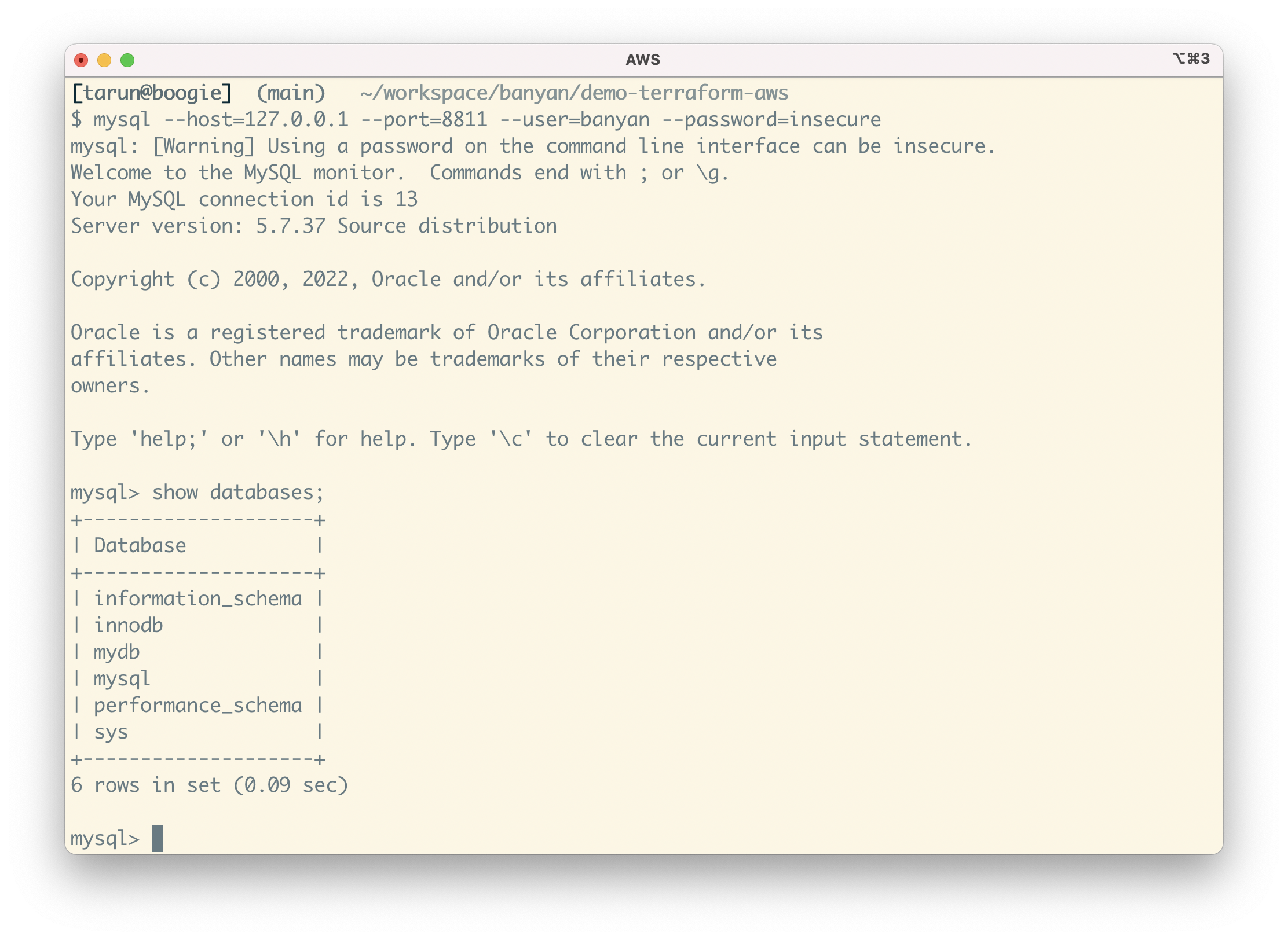 mysql --host=127.0.0.1 --port=8811 --user=banyan --password=insecure