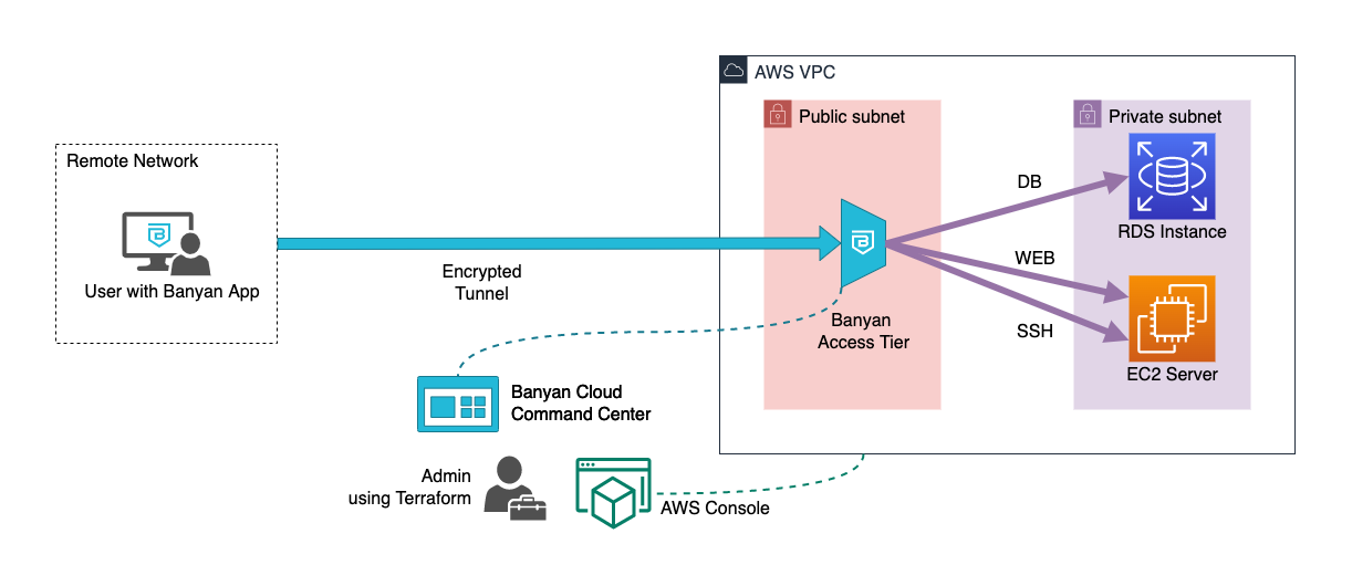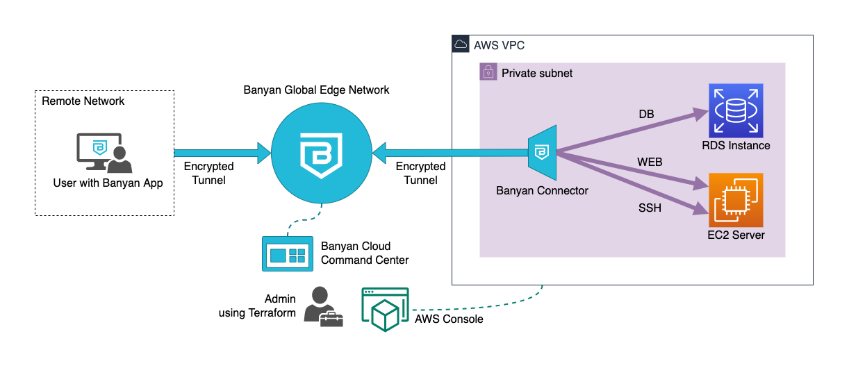 - Banyan Connector - deploy an EC2 instance with the Connector to create an outbound connection to the Banyan Global Edge network, so you can manage access to your AWS environment