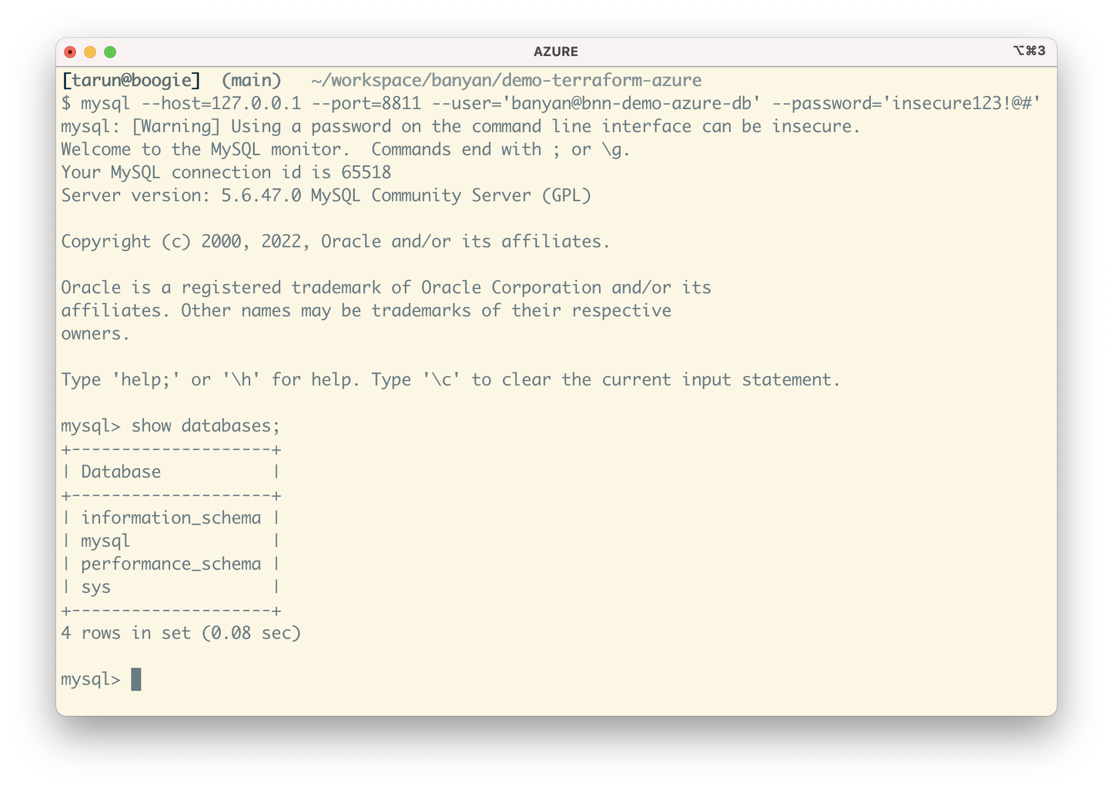 mysql --host=127.0.0.1 --port=8811 --user='banyan@bnn-demo-azure-db' --password='insecure123!@#'