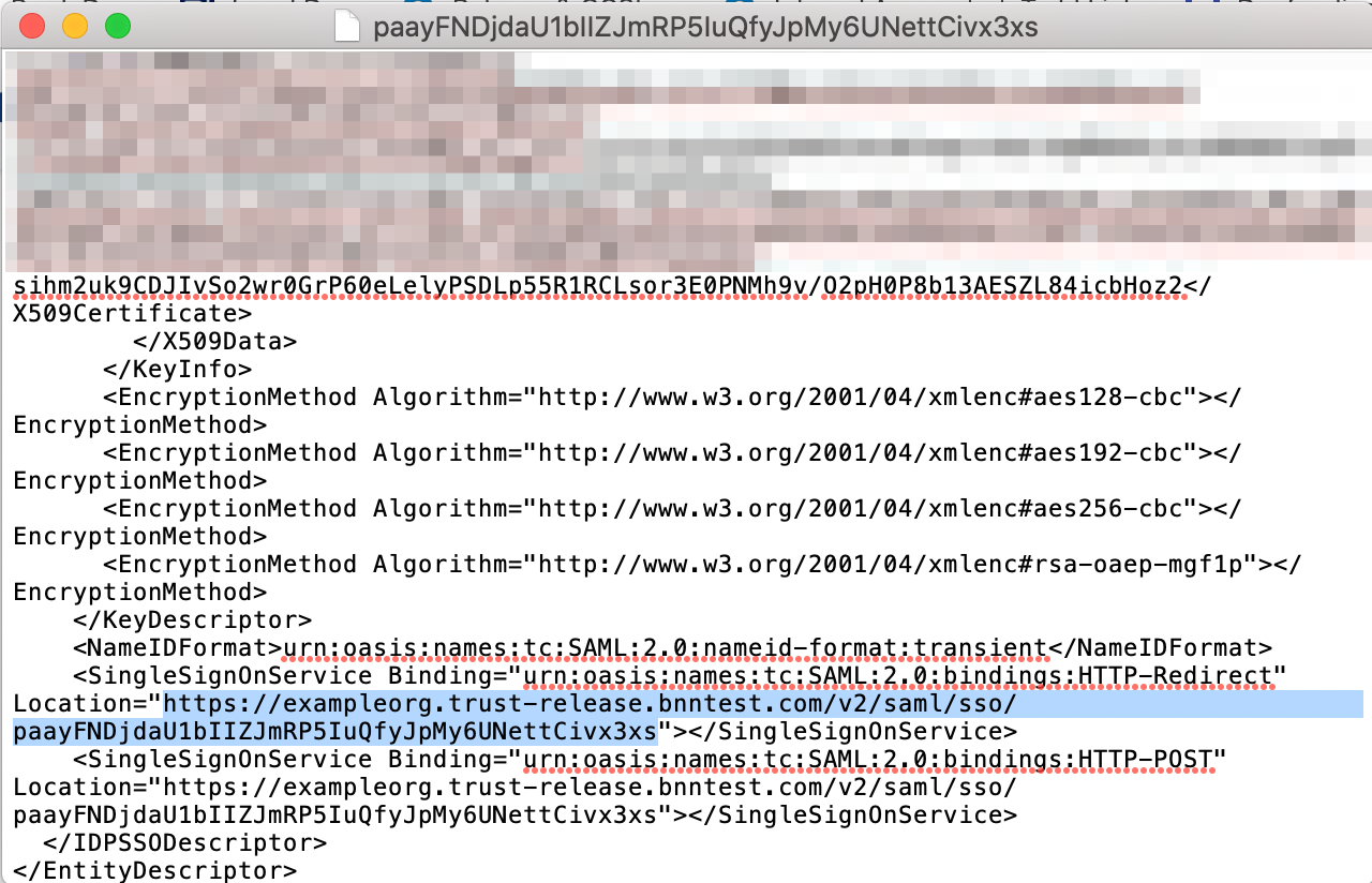 3.4 Also in the downloaded metadata xml file, locate and take note of the <SingleSignOnService Location> string. You will enter this value in Step 4 (below).