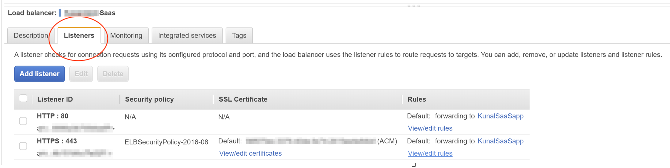 3.1 Log in to your Amazon AWS account, and then navigate to Services > Compute > EC2 > Load Balancing > Load Balancers > (your configured Application Load Balancer) > Listeners tab.