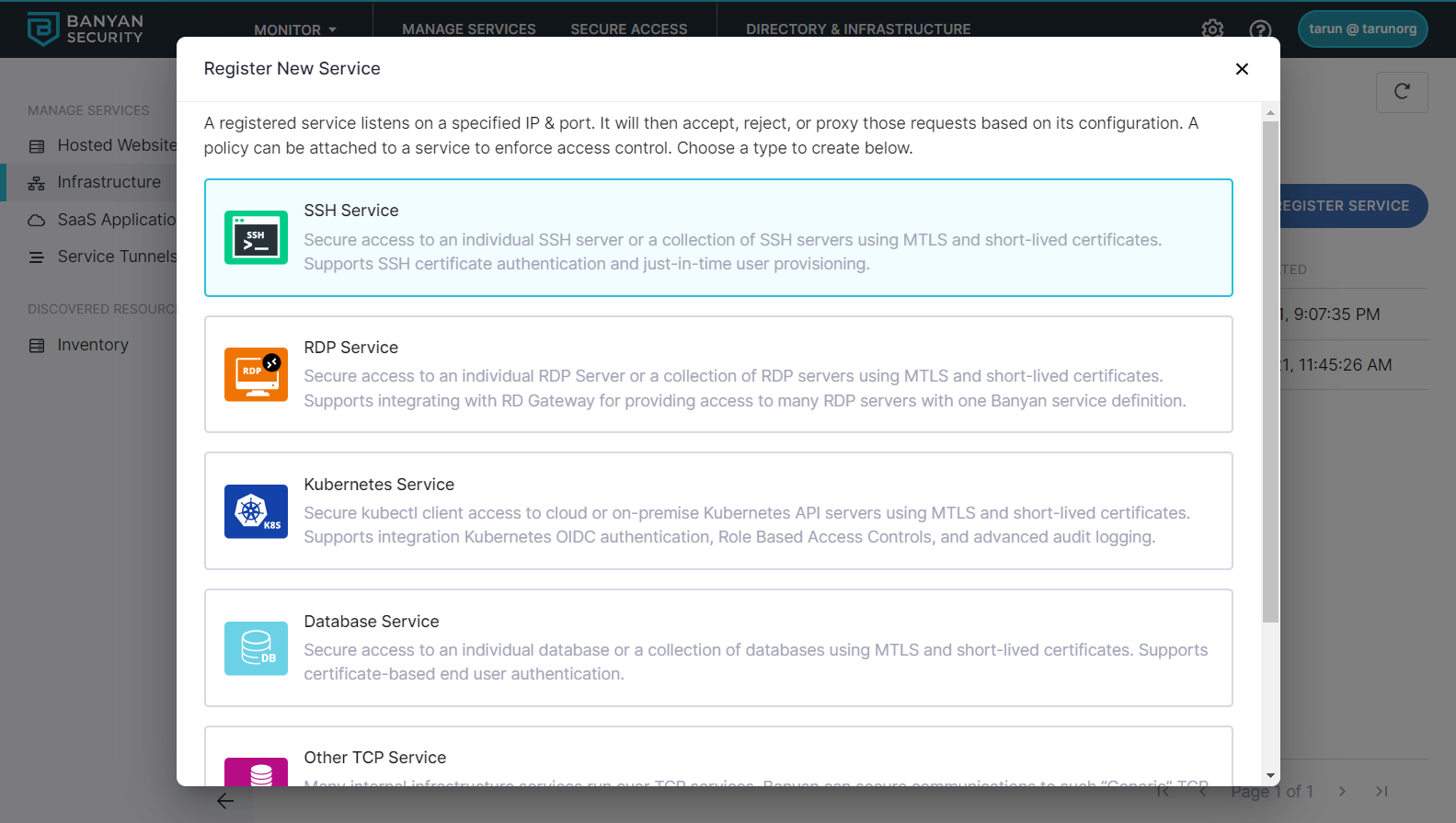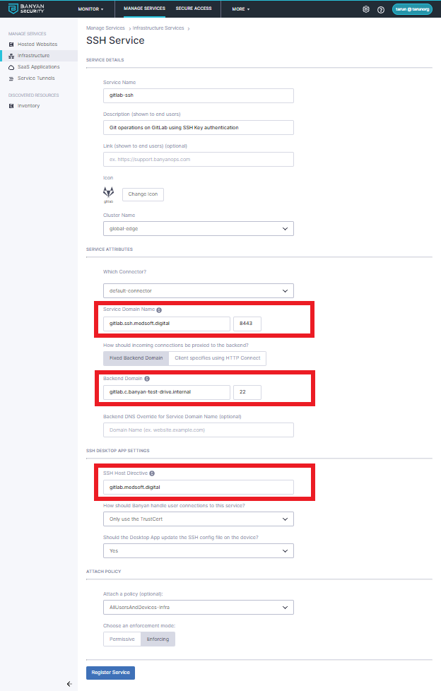 1.1 Register an SSH service for GitLab. Navigate to Manage Services > Infrastructure > Register New Service.