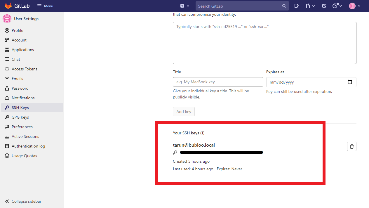 2.1 In GitLab, ensure your user account is configured for SSH Key authentication