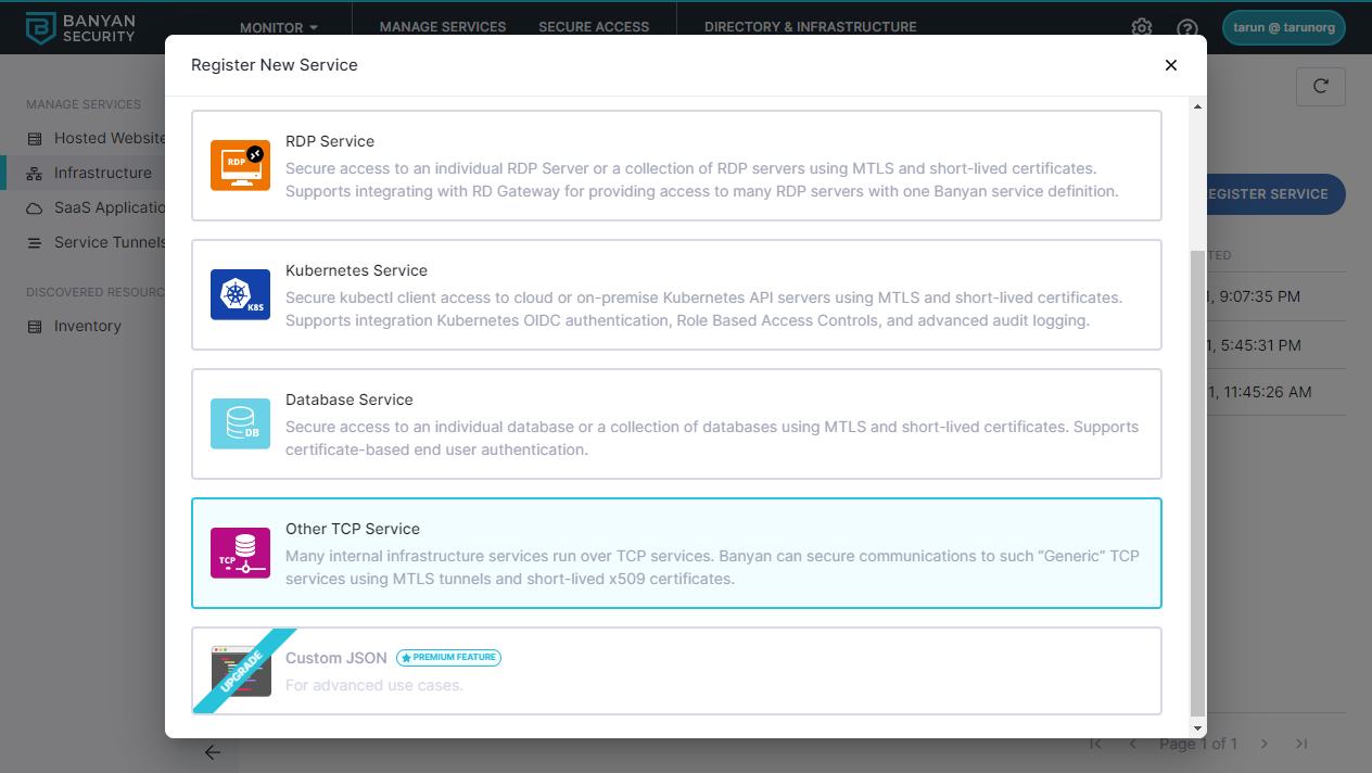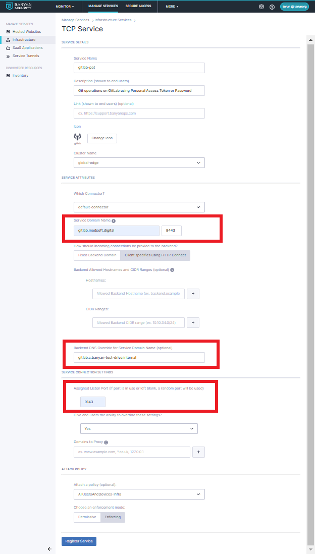 3.1 Register an Generic TCP service for GitLab. Navigate to Manage Services > Infrastructure > Register New Service.