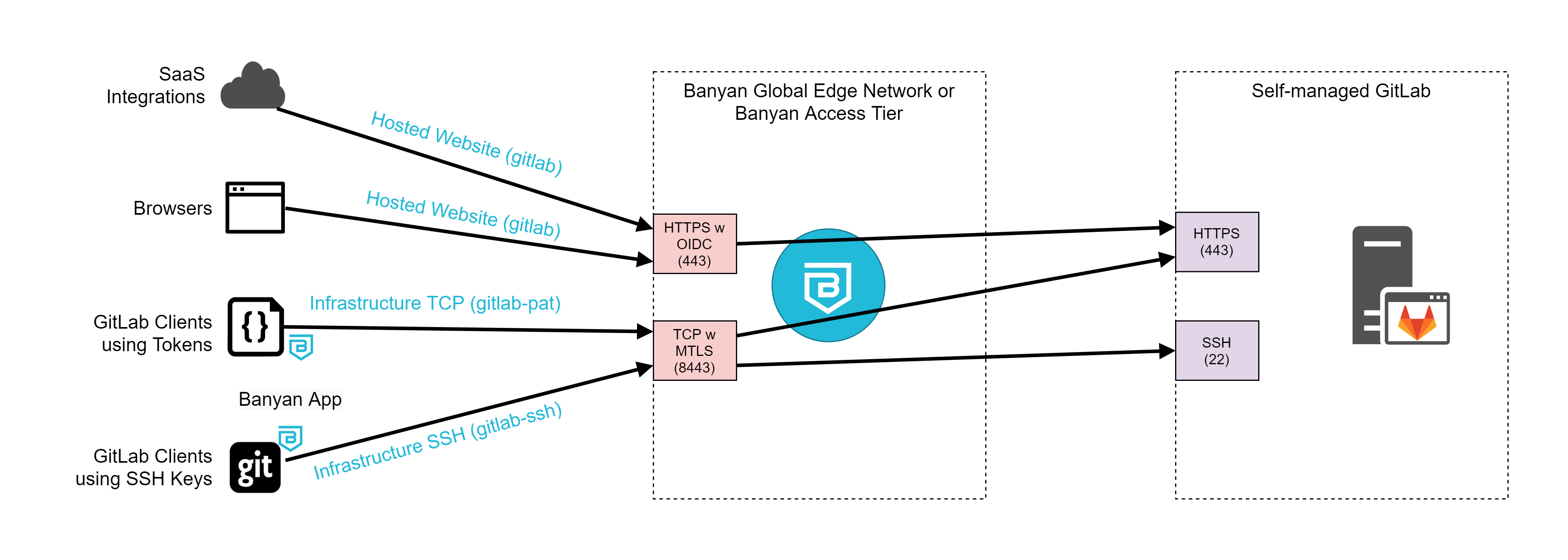 For Git operations, we use Banyan’s infrastructure service capabilities with short-lived X509 certificates. We will define 2 additional services for each auth mechanism and protocol that GitLab supports: