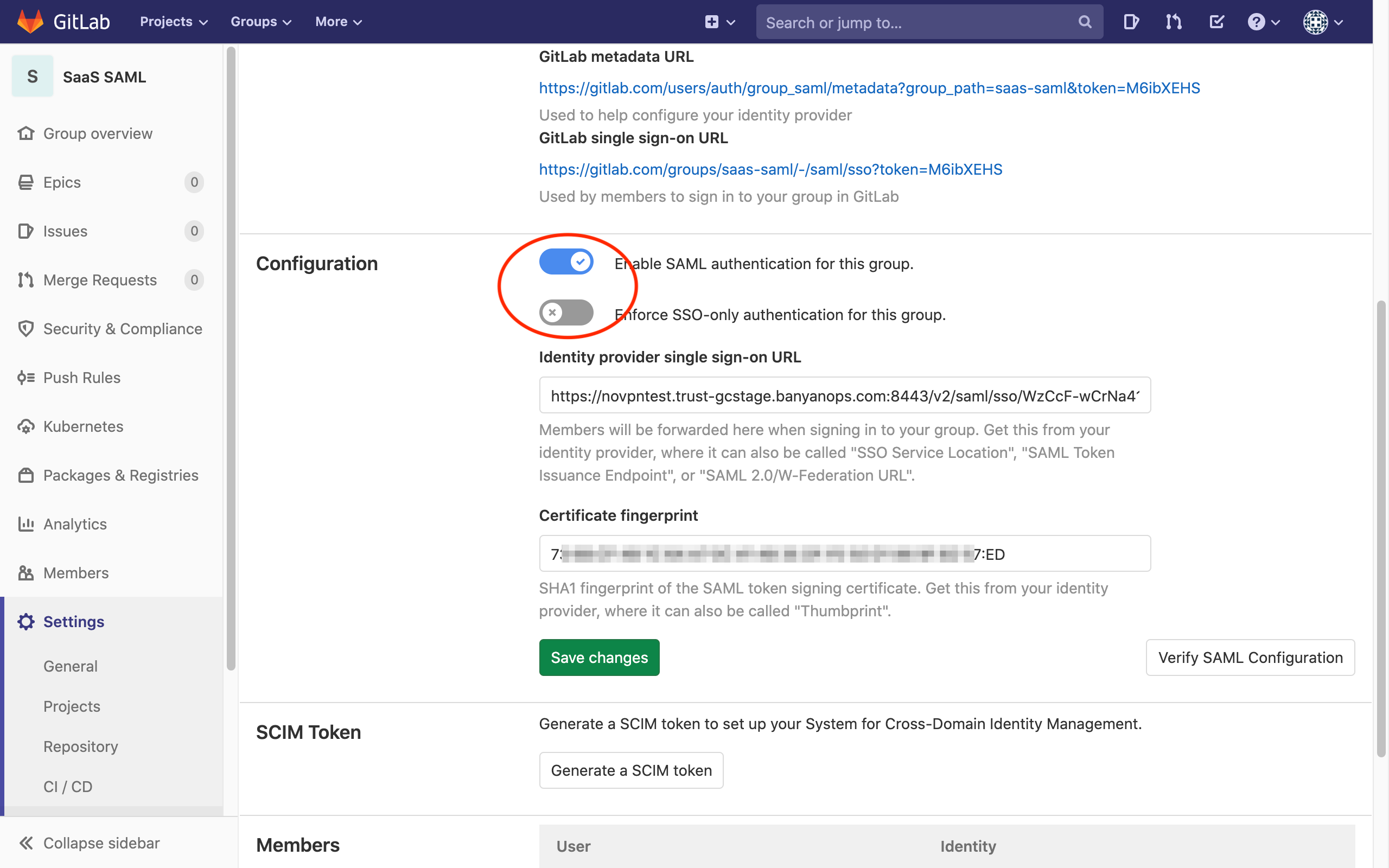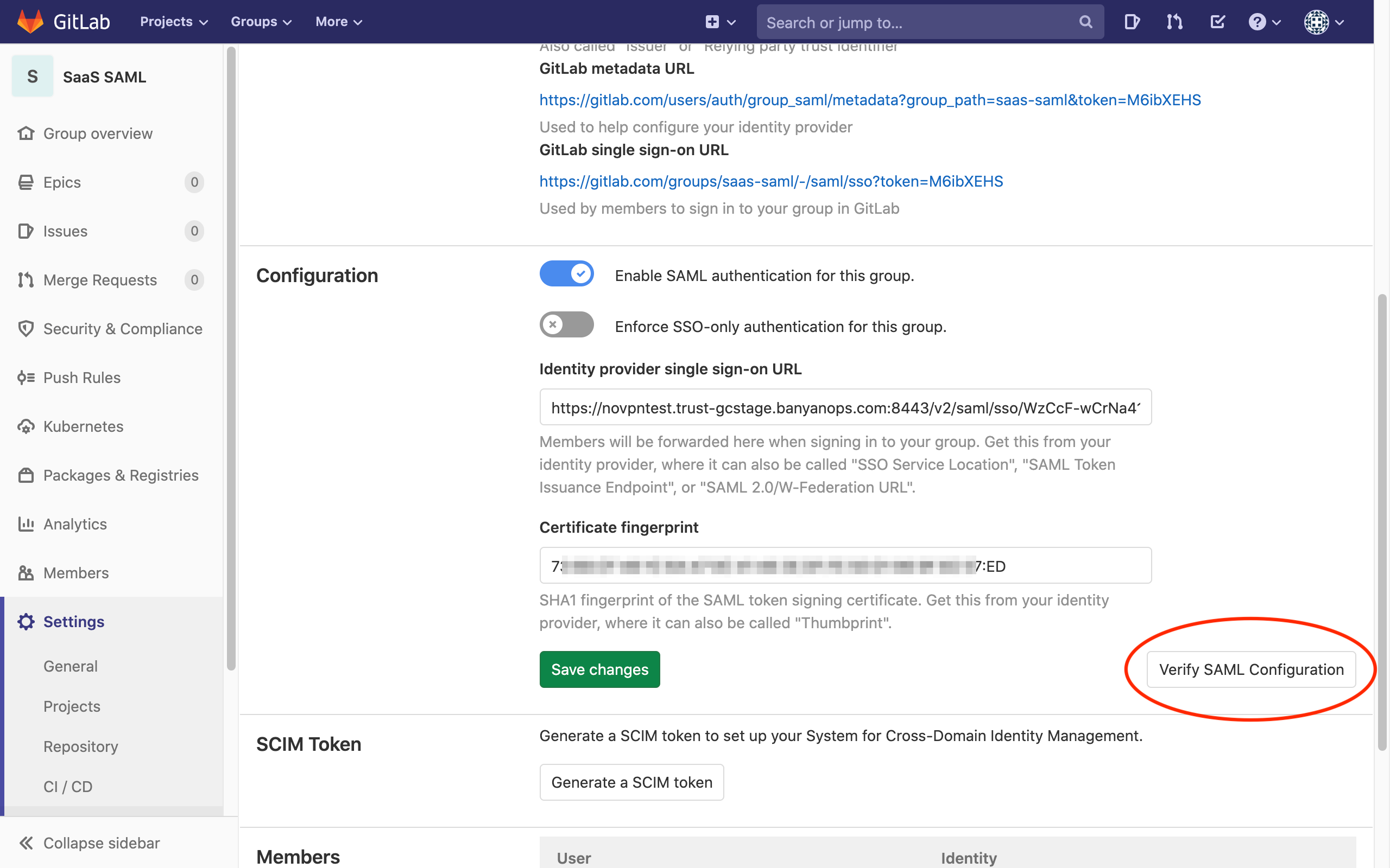 4.1 Log in to your GitLab account, and then navigate to Groups > (group you are configuring) > Settings > SAML SSO.