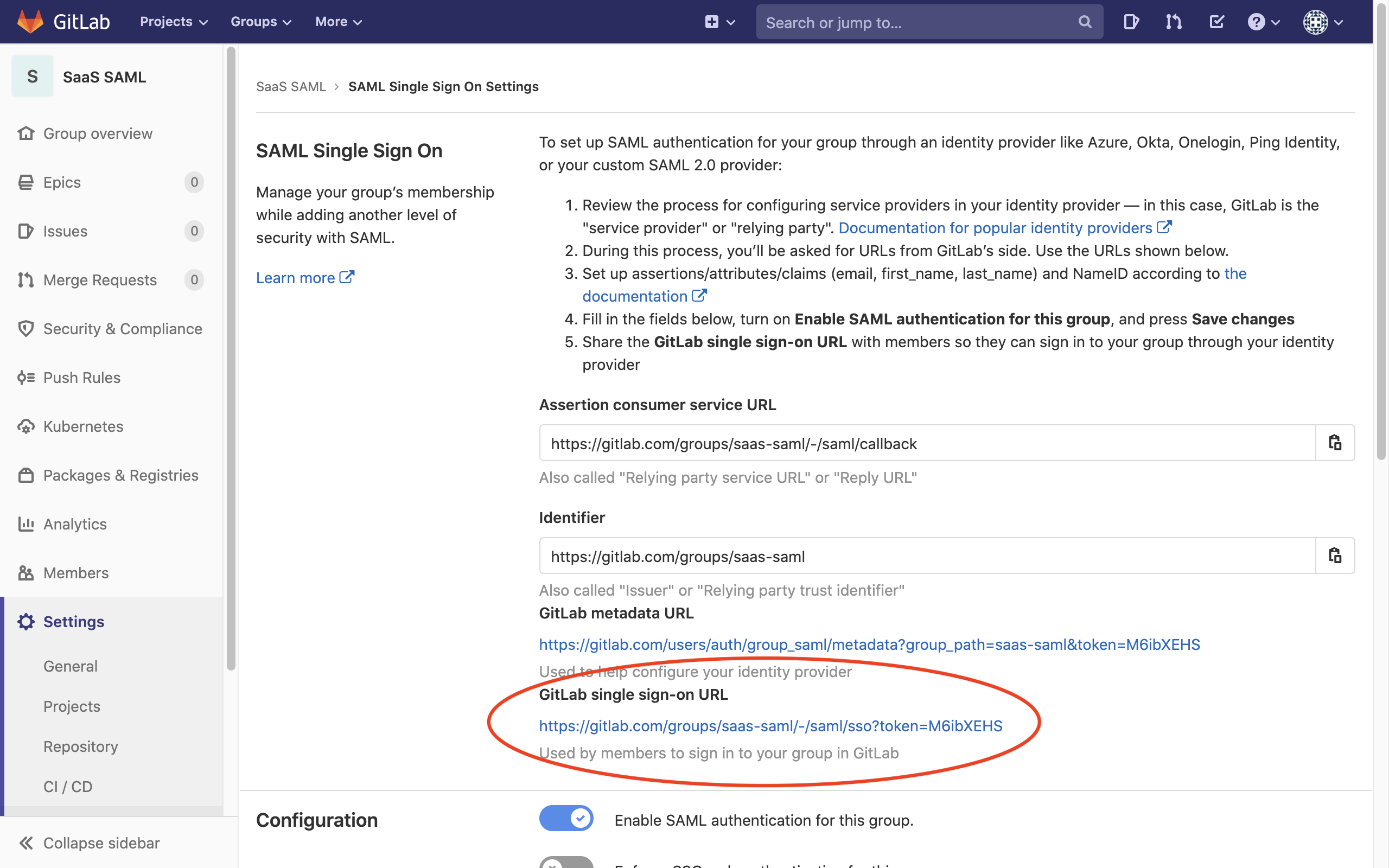 4.2 In the Configuration section, switch the Enable SAML authentication for this group. toggle to the right (on). Optionally, switch the Enforce SSO-only authentication for this group. toggle to the right (on).