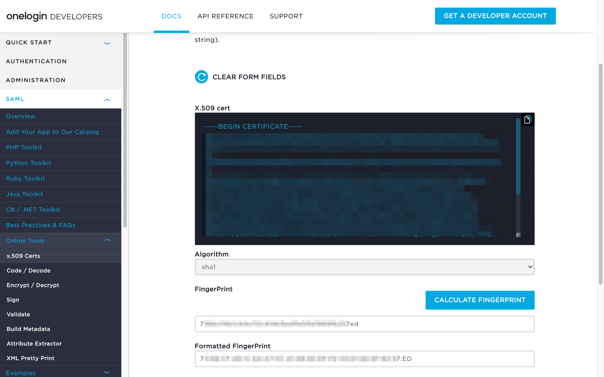 3.4 Using a publicly available fingerprint calculator (such as OneLogin’s tool), paste the formatted X509Certificate string (created in Step 3.3) and calculate the SHA1 fingerprint. Take note of the formatted fingerprint (to be used in Step 4.4).