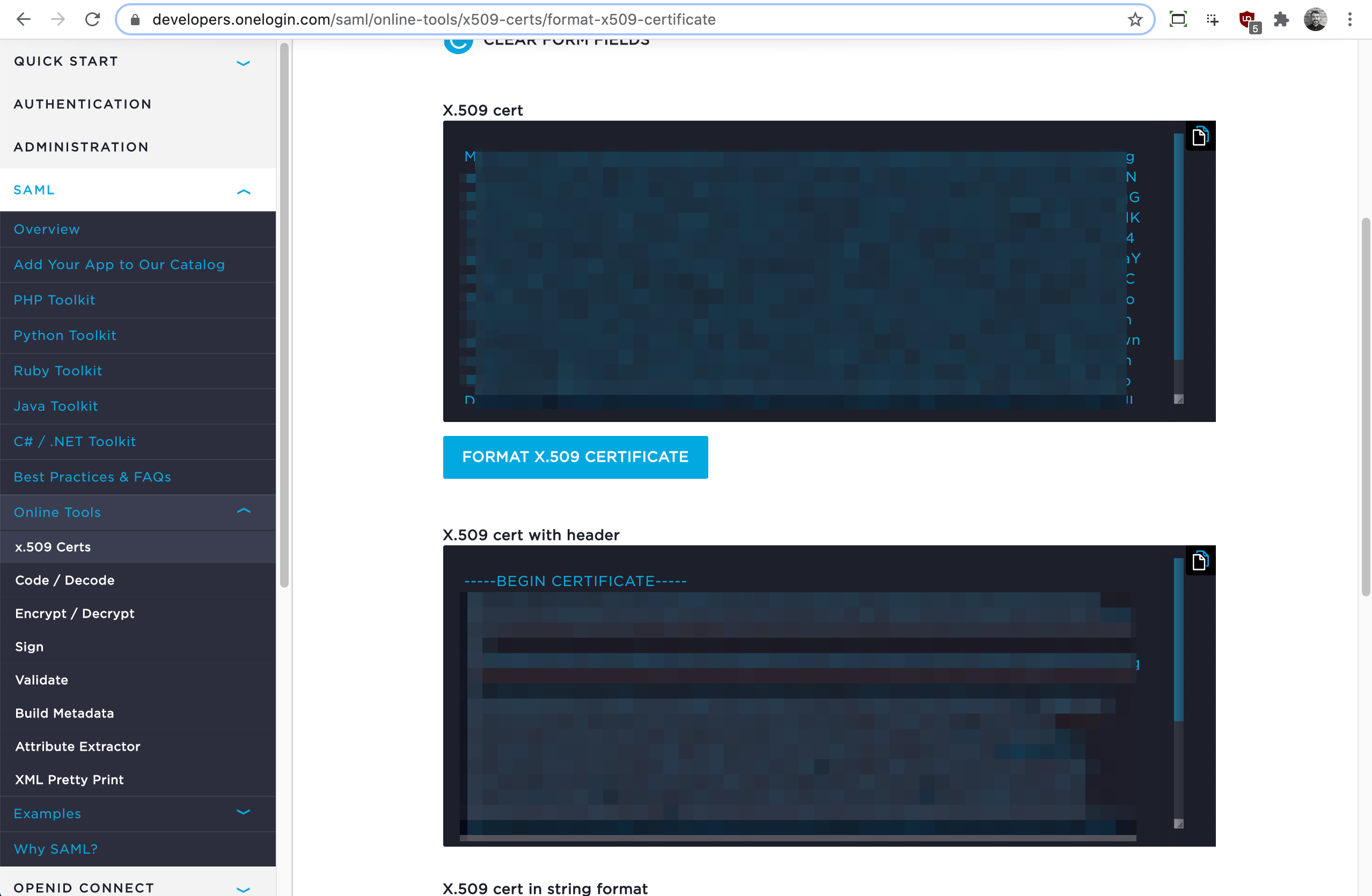 3.3 Using a publicly available certificate formatter (such as OneLogin’s tool), paste the X509Certificate string (copied in Step 3.2) and format the X.509 cert (with header). Take note of the formatted certificate (to be used in the step below (3.4).