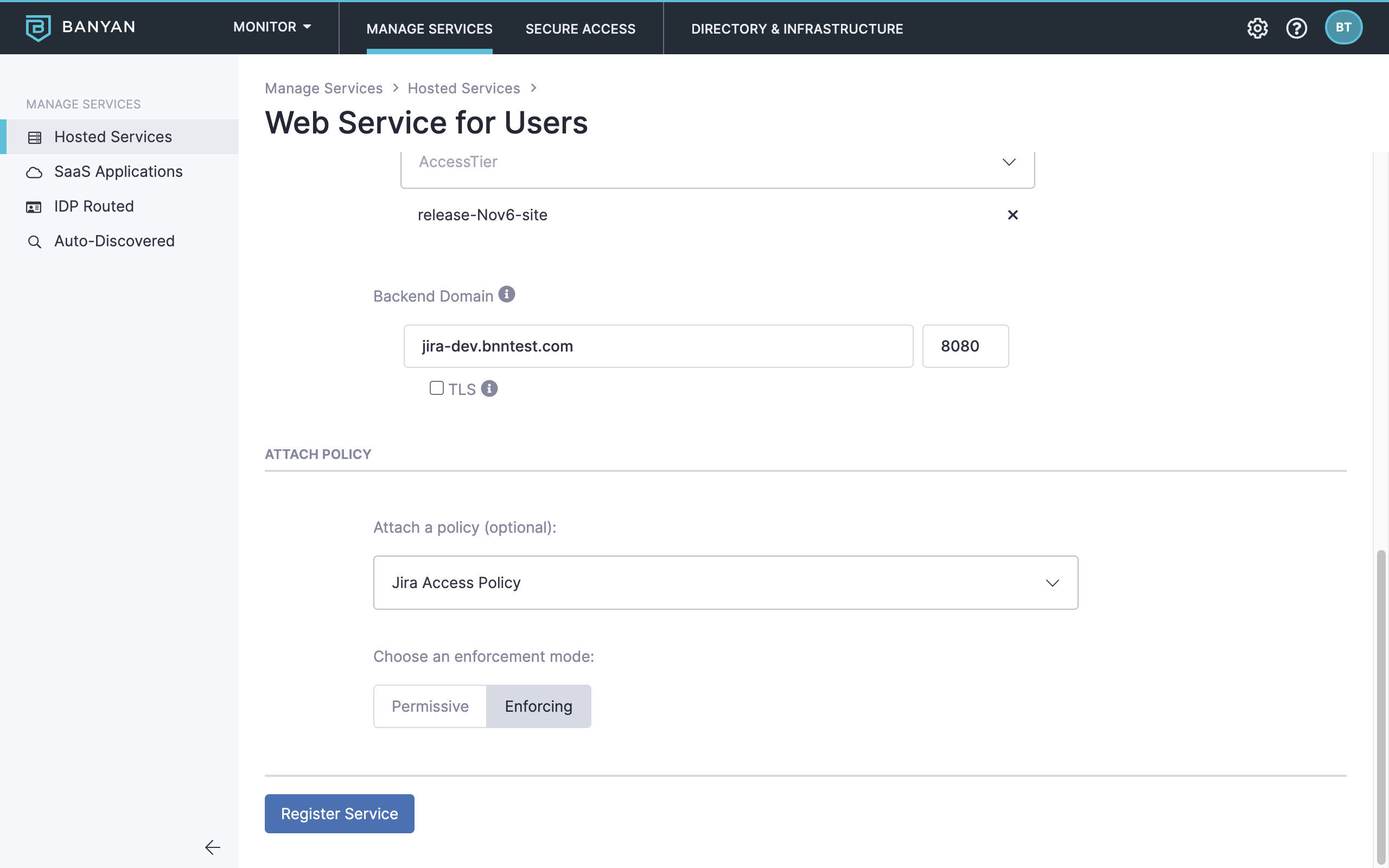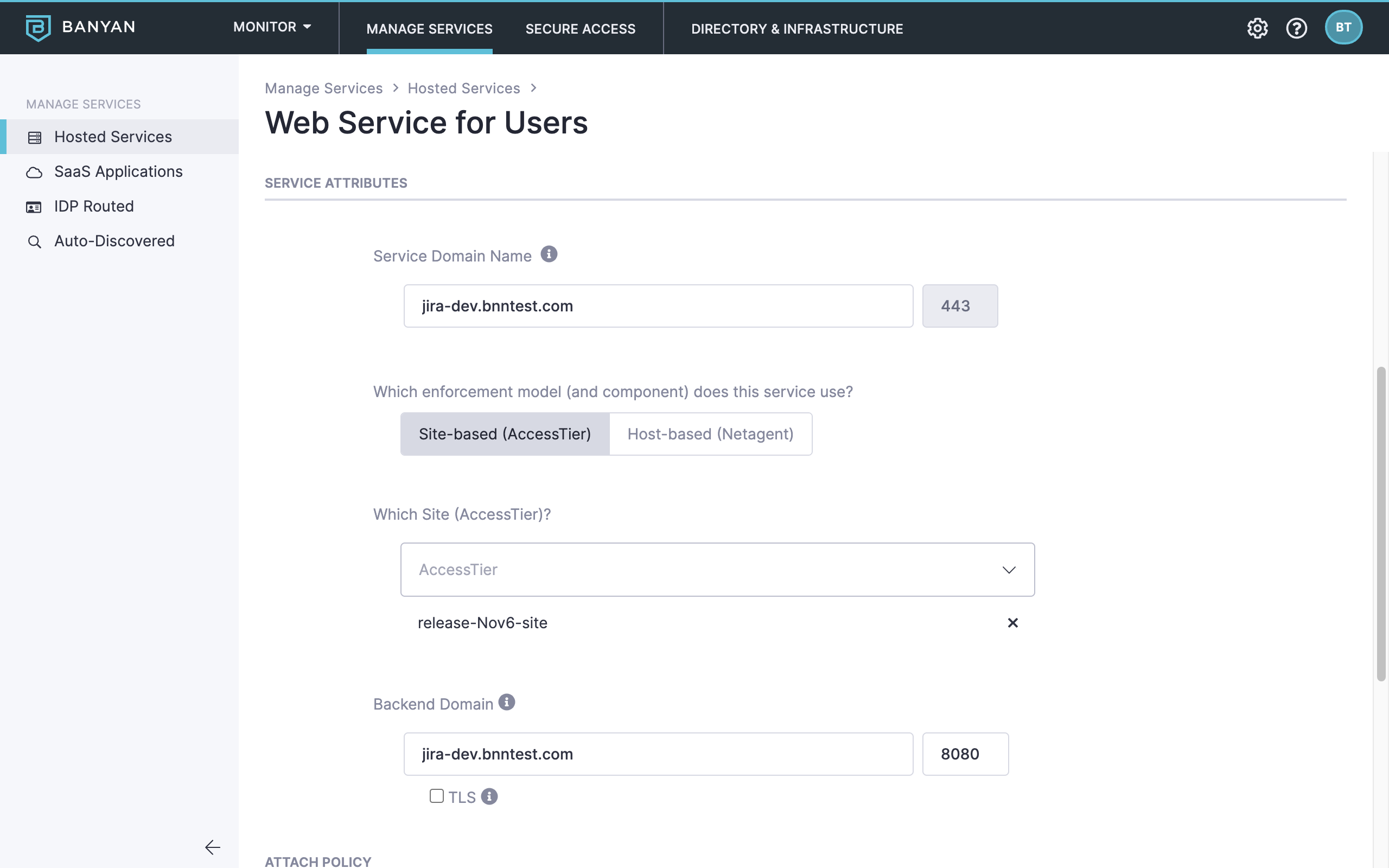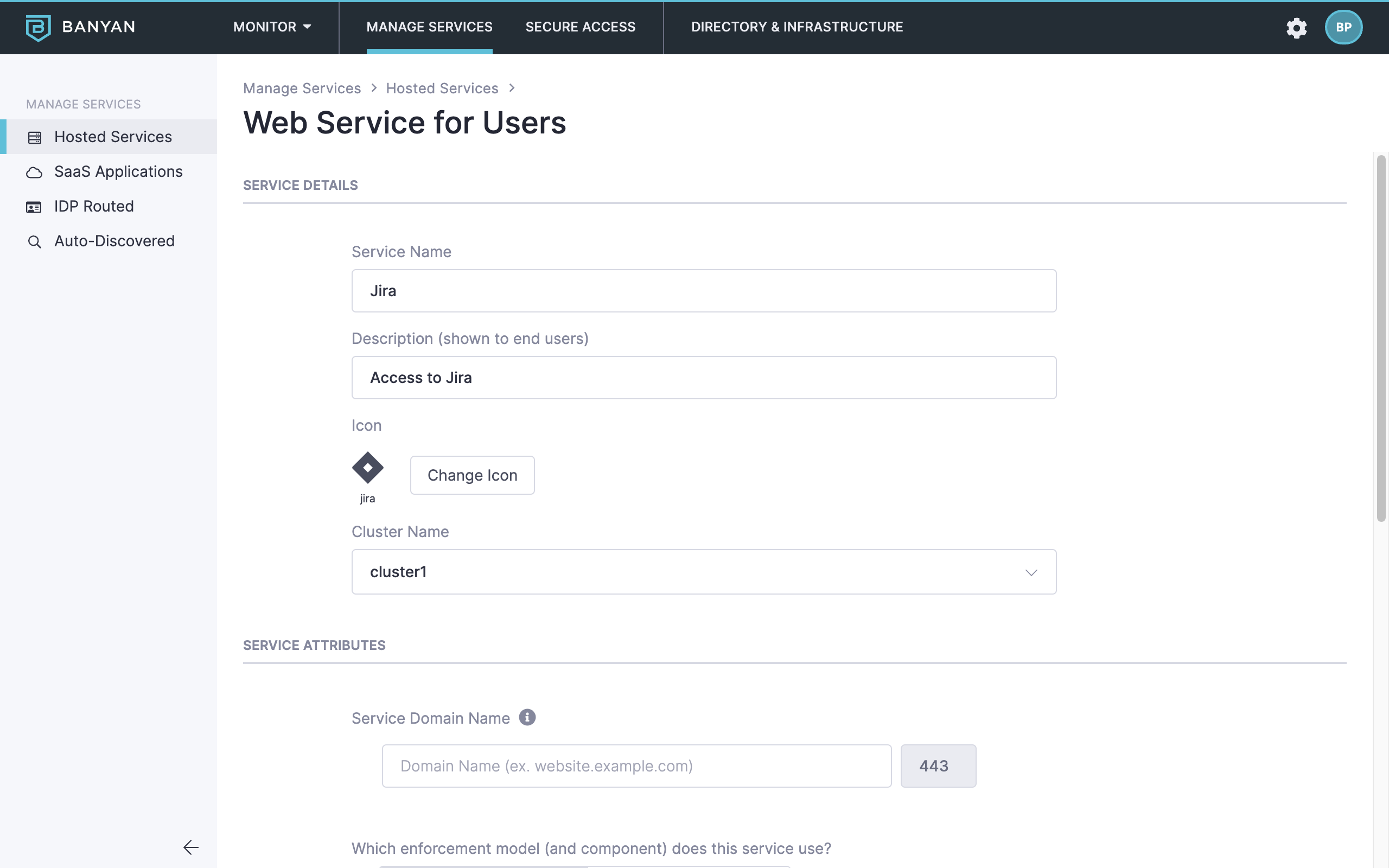 - Enter the Service Domain Name of the Access Tier behind which the hosted Jira service is deployed and leave the Port as