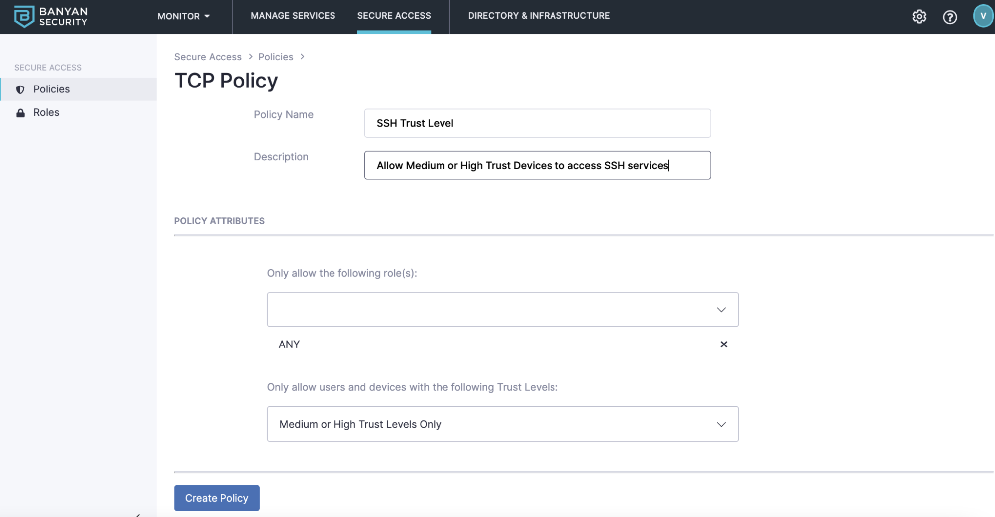 TCP Policy Let’s create an easy to remember Policy Name like Team - SSH Trust Level and add a description. For the Policy Attributes, if you want this policy to apply to all your roles, select ANY. You can also individually select the role(s) that will apply here. Next, we need to define the users and devices trust level in this policy. If you select no trust level then any user and device will be allowed. You can also select High or Medium or High Trust levels. For this example, we’ll select Medium or High Trust Levels only. Select Create Policy to finish the setup.