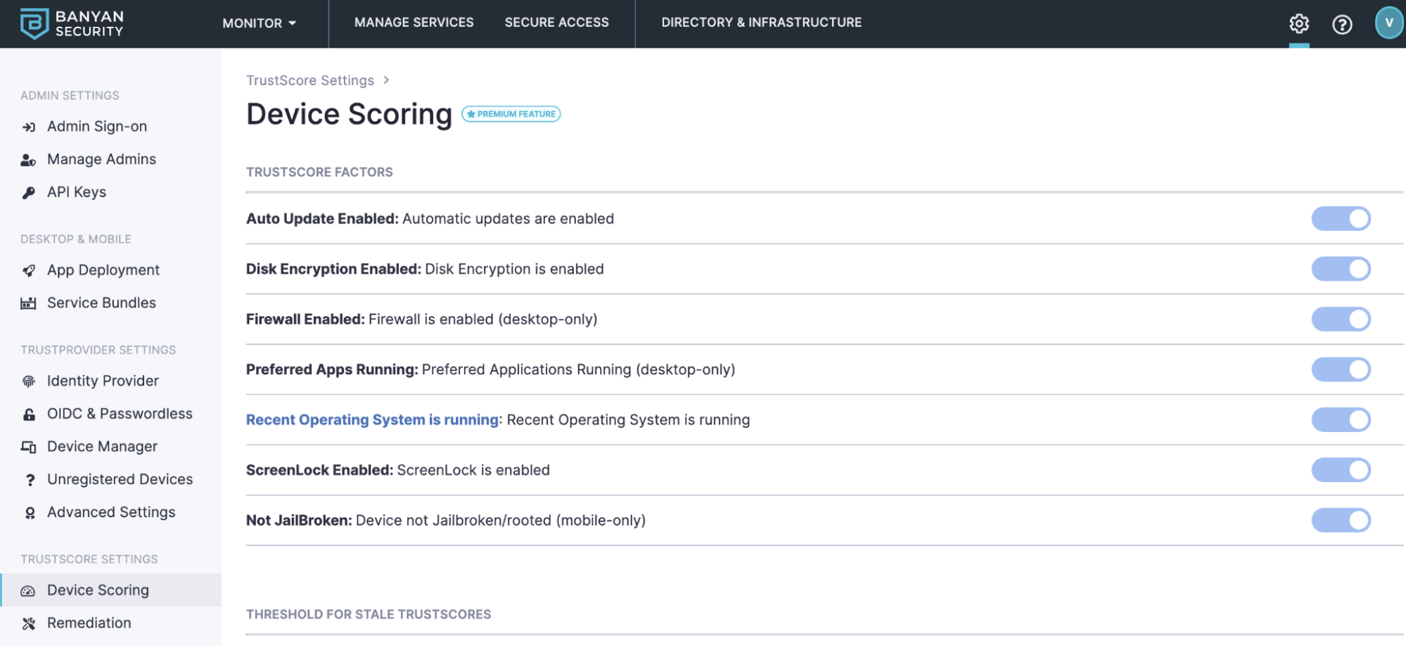 Banyan’s TrustScore can be set up in the Banyan Command Center under [Settings ->TrustScore Settings]. The Banyan app deployed on devices collects information about the device to calculate its number. As an administrator of Team Edition, you can verify the OS is up-to-date, disk encryption is enabled, and firewall is enabled. Banyan is currently checking each endpoint to verify it is running at least the last two or three versions of the OS.
