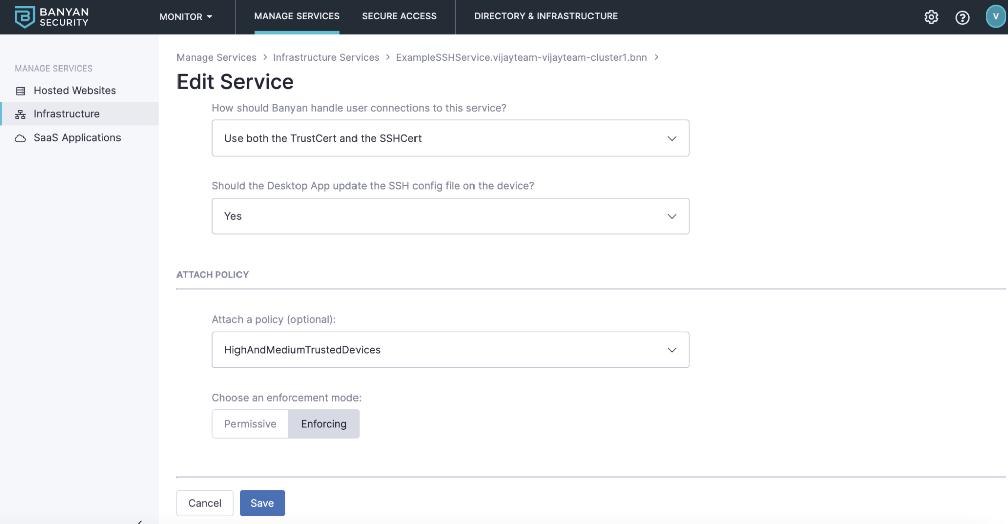Once we create a device trust policy for infrastructure, we need to apply this new policy to our service(s). To do this, select Manage Services -> Infrastructure and select the service that you want to apply this newly created policy. We’ll click on the service name, select edit, and scroll down to attach a policy. From the dropdown, select the policy we just created. With Banyan, there’s two enforcement modes that you can choose from. Permissive allows you to view the trust scores of the devices accessing the service before making access control decisions. If you would like to ensure these devices meet the policy created, select “Enforcing” to block devices that do not meet your policy.