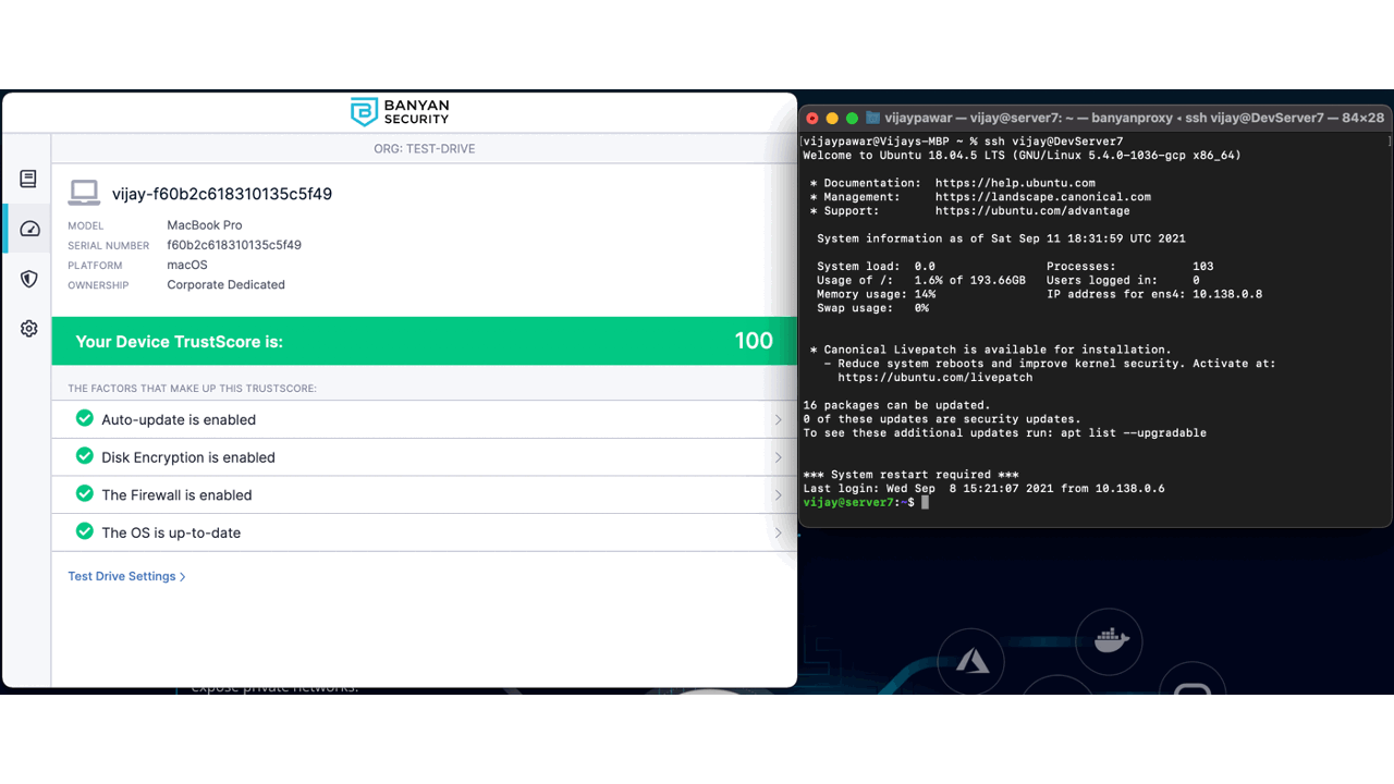 Remote access to infrastructure in Banyan’s Team Edition is powered by Banyan’s Global Edge Network and the Banyan services catalog. Banyan’s app continuously evaluates the device against changing trust factors defined by the team edition’s administrator. Banyan’s trust scoring evaluates against device encryption, firewall being enabled, OS up to date, and even specific apps that should be running on a device. For those looking for more enterprise level integrations, Banyan’s Business and Enterprise Editions integrate with leading device managers and EDR vendors like Crowdstrike for more advanced trust scoring decisions.