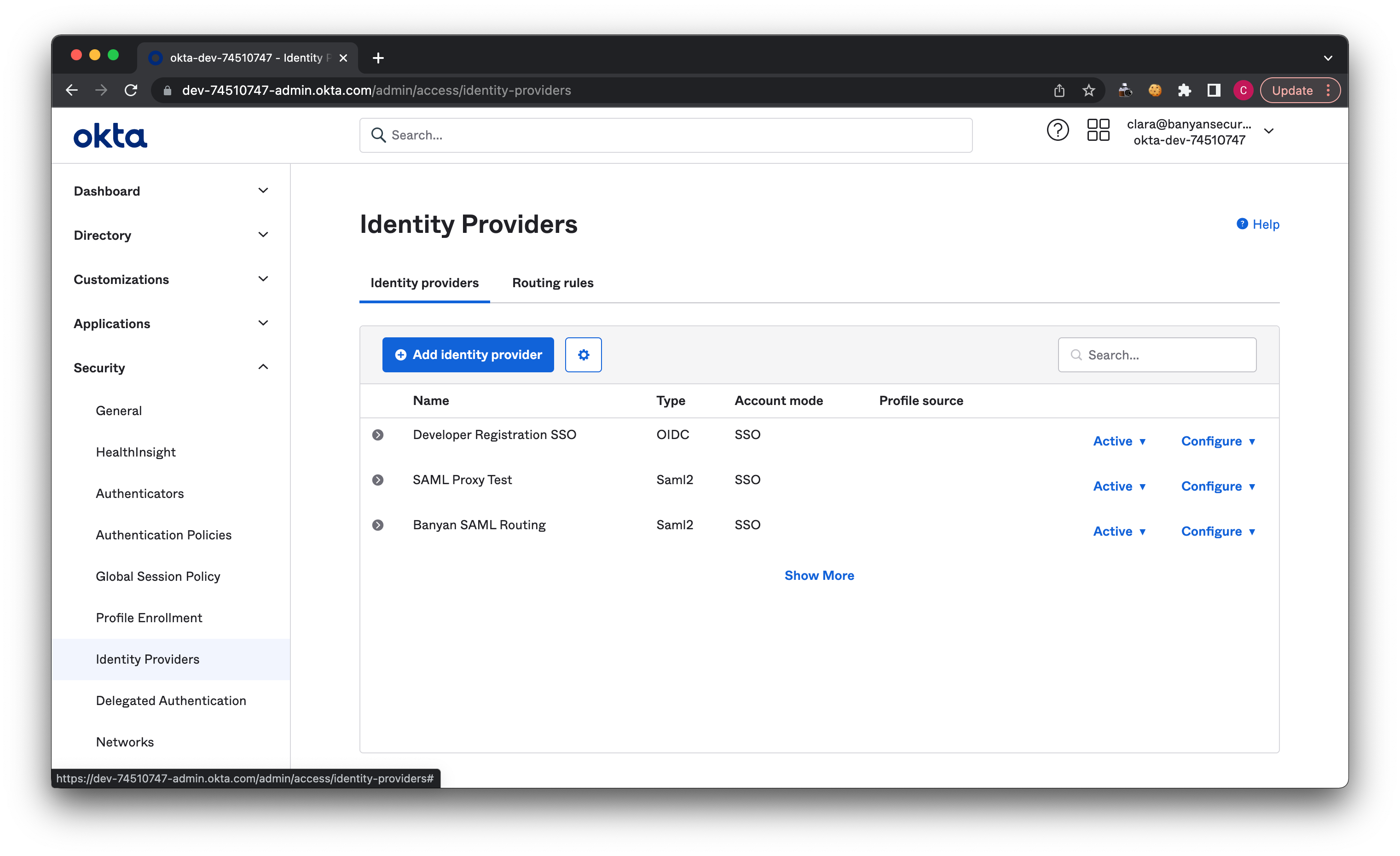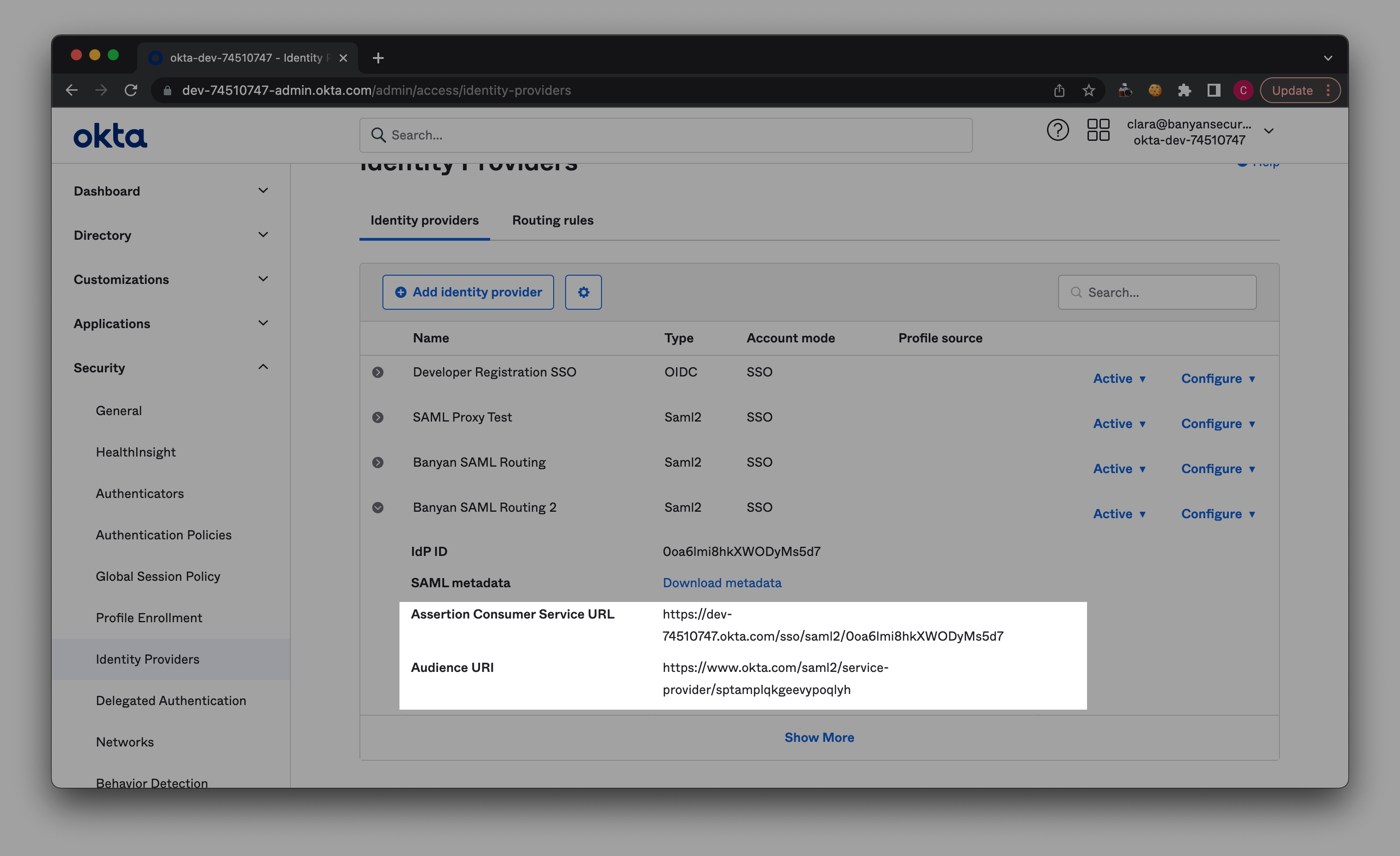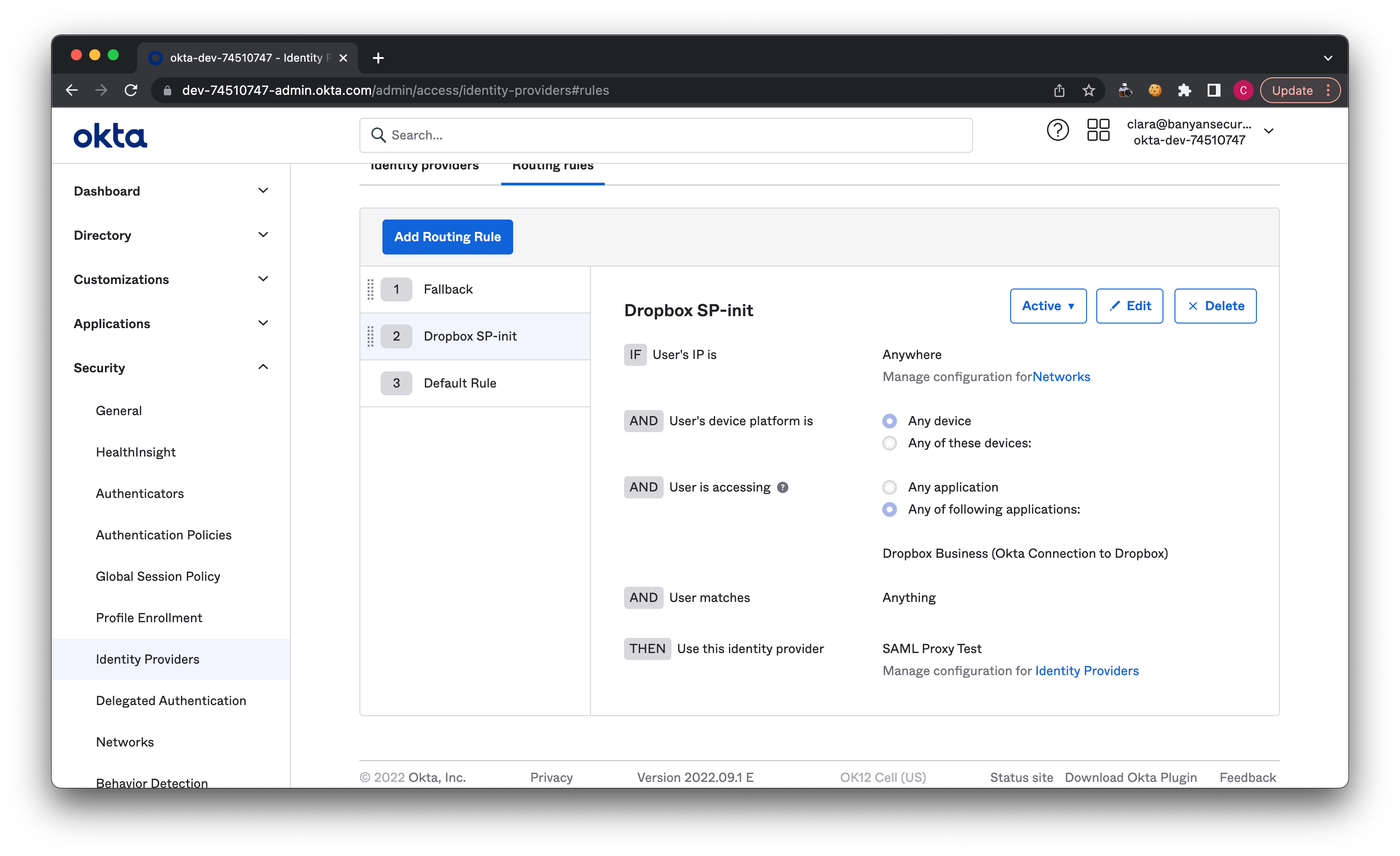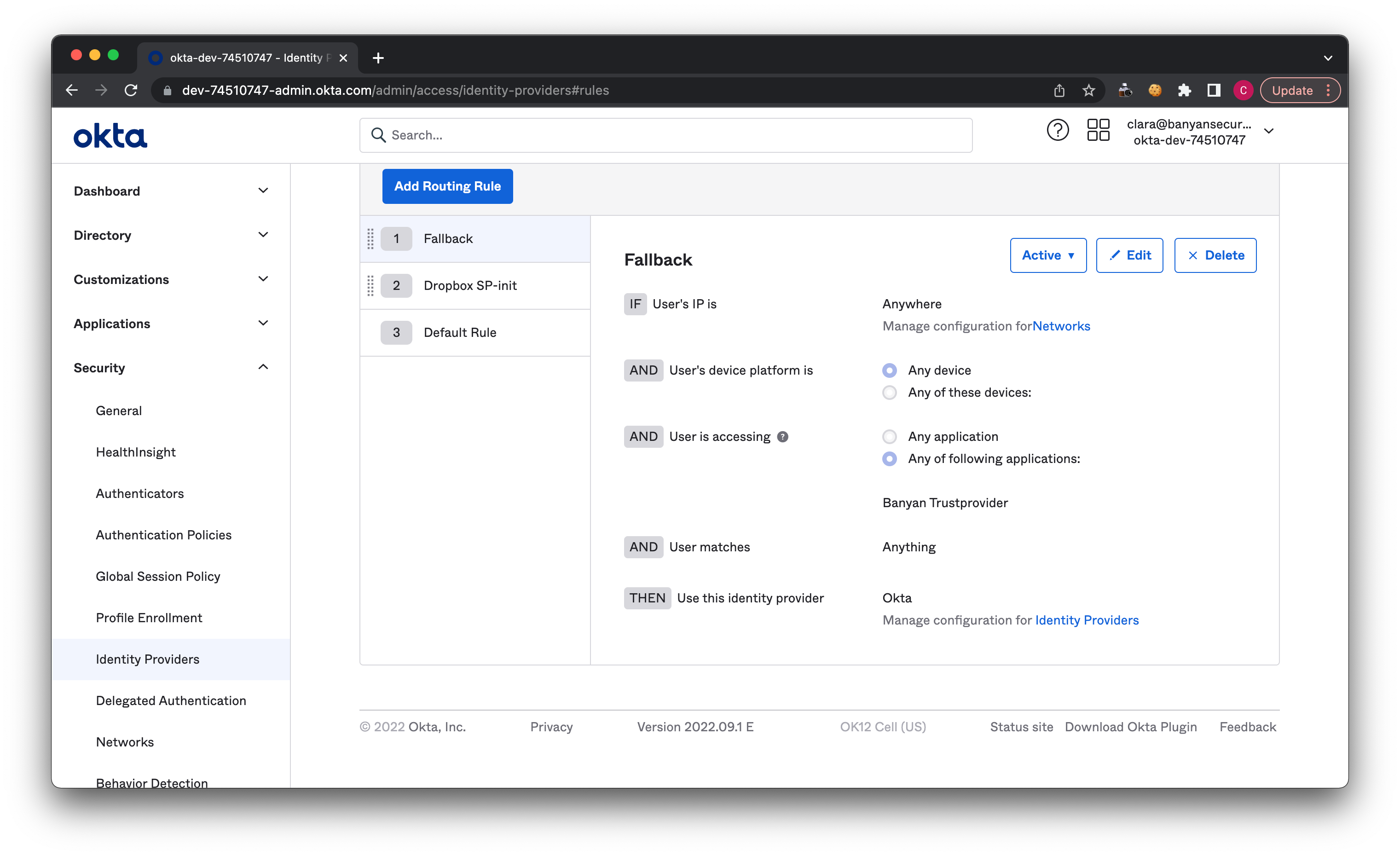5.1 In Okta, navigate from Security > Identity Providers > Routing Rules.
