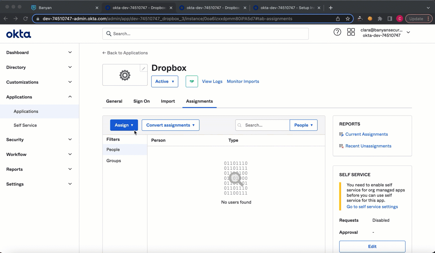 6.1 In Okta, on your Application’s page under Assignments, select Assign, and choose which user groups you want to assign the published SaaS app to.