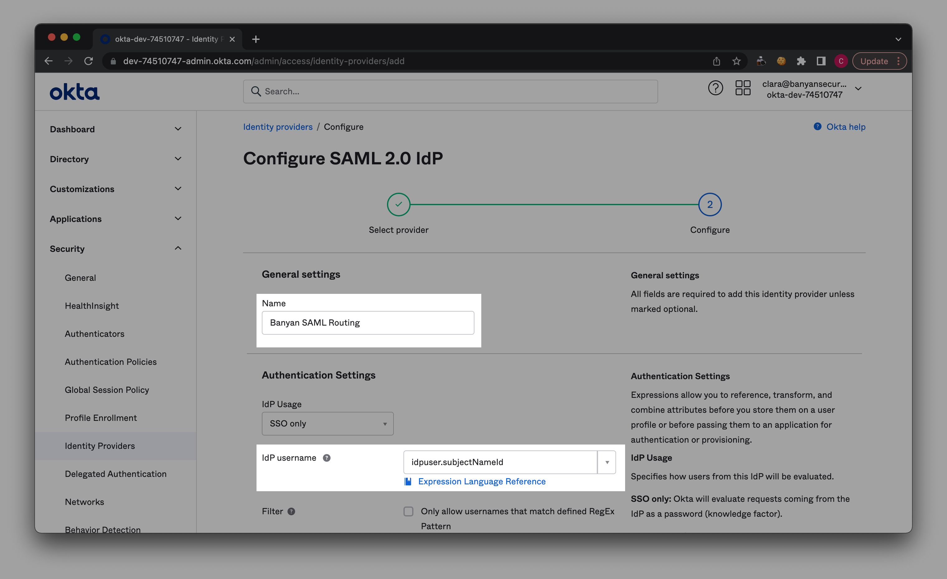 2.3 Name the Identity Provider that you want to add (e.g., “Banyan SAML Routing”).