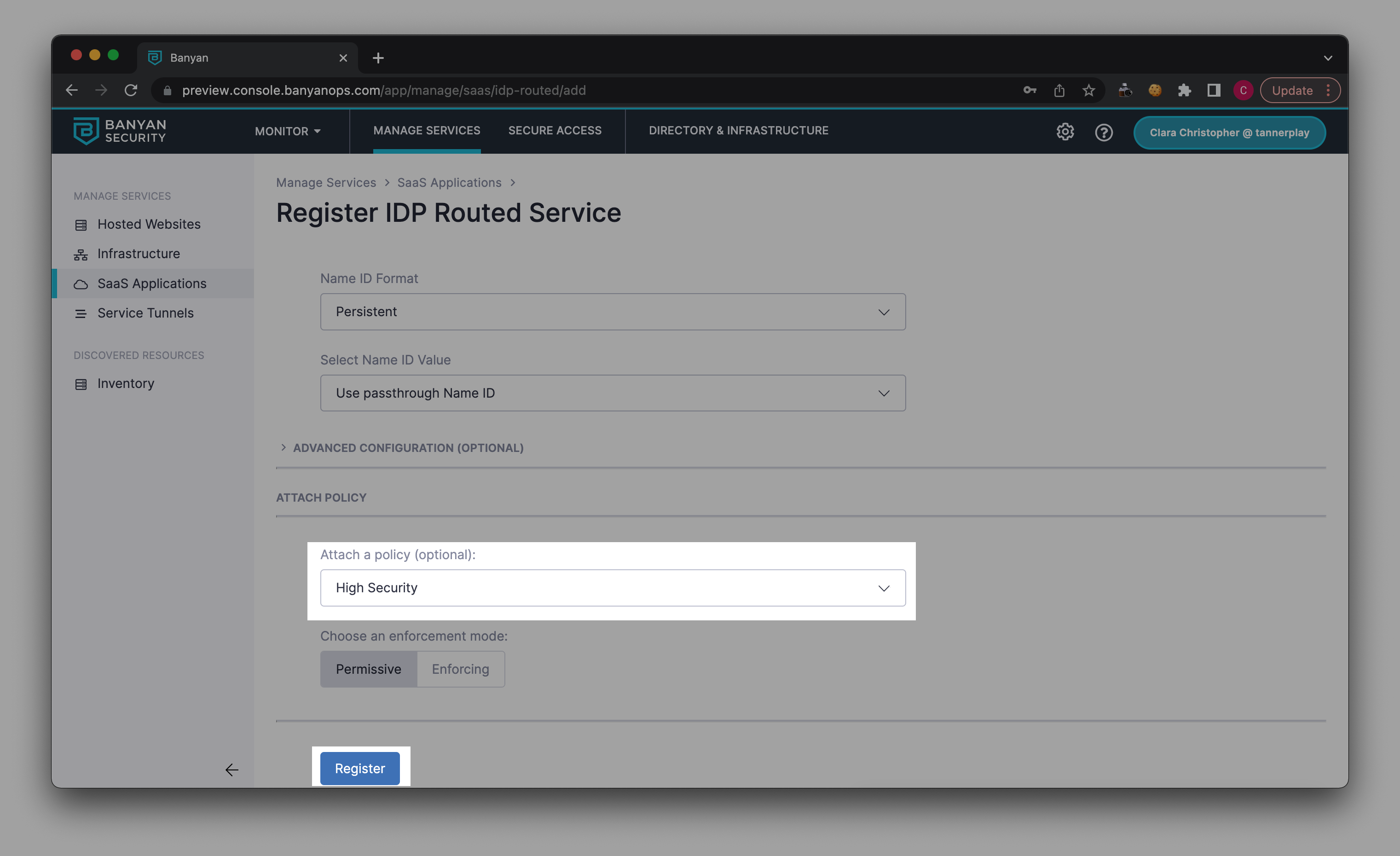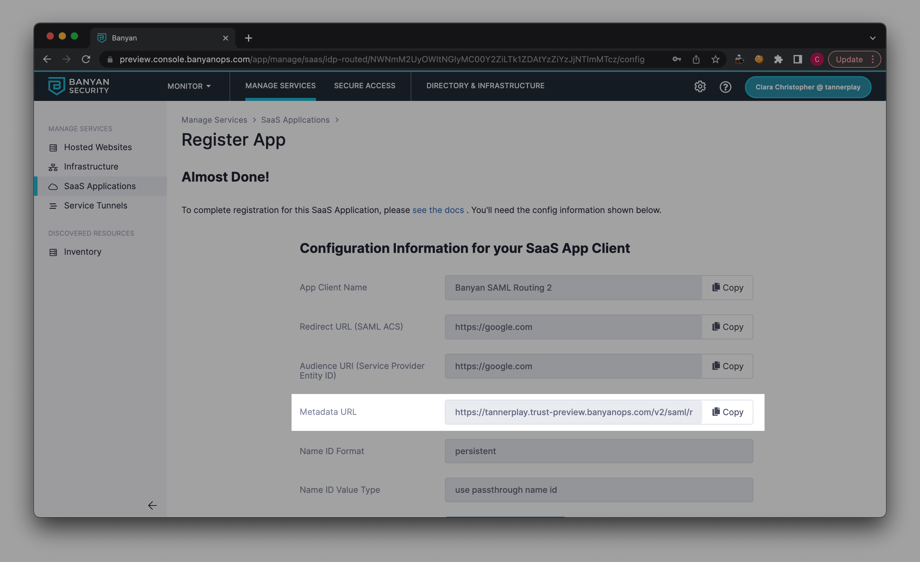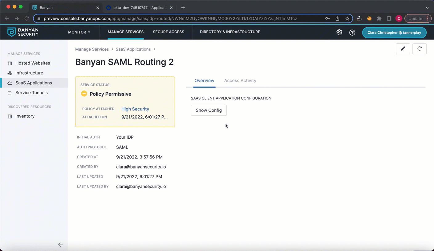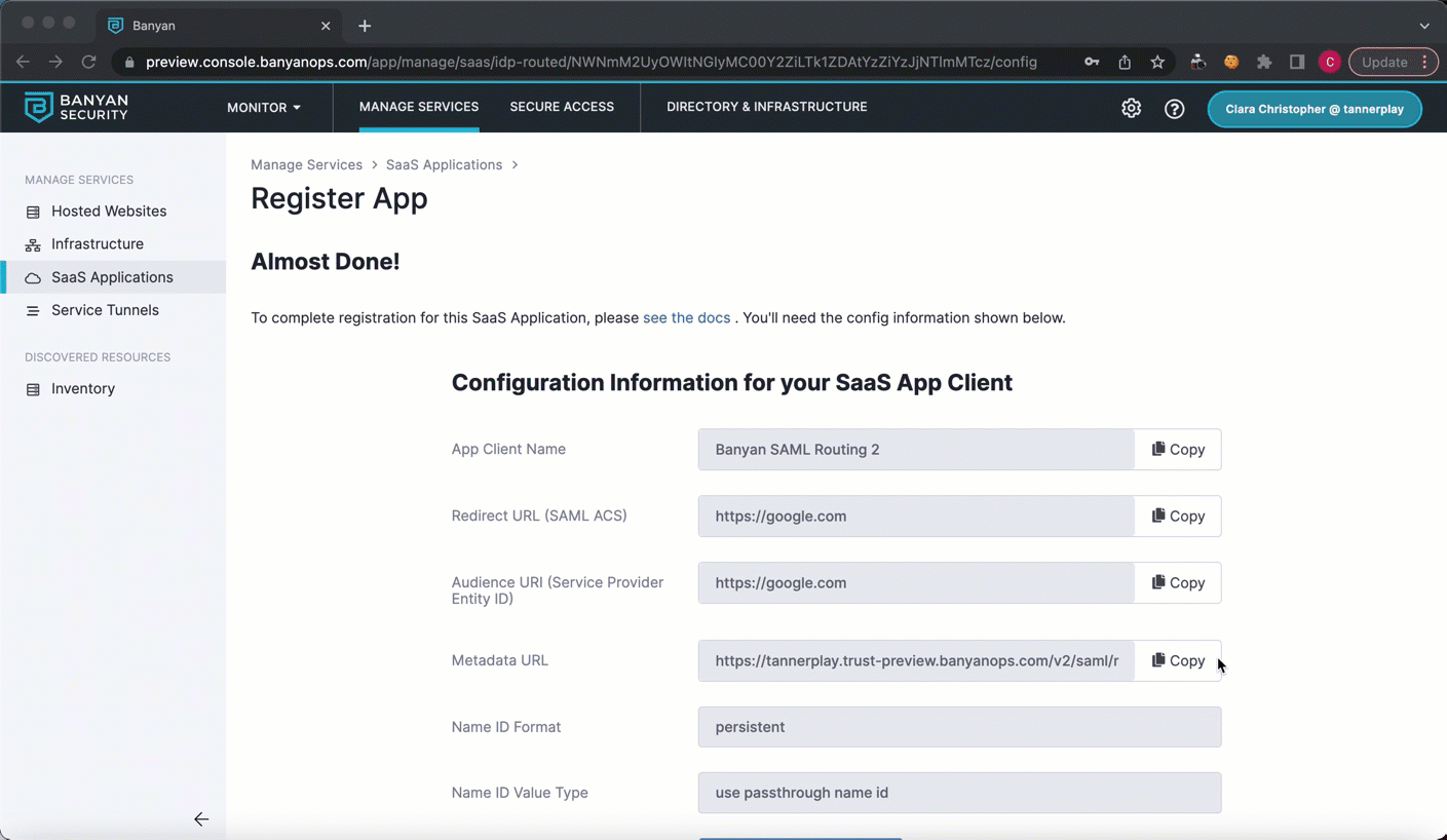 1.8 Navigate back to Banyan’s Command Center (Manage Services > SaaS Applications > Register Apps), and select Continue. This will lead to your published SaaS app service detail page.