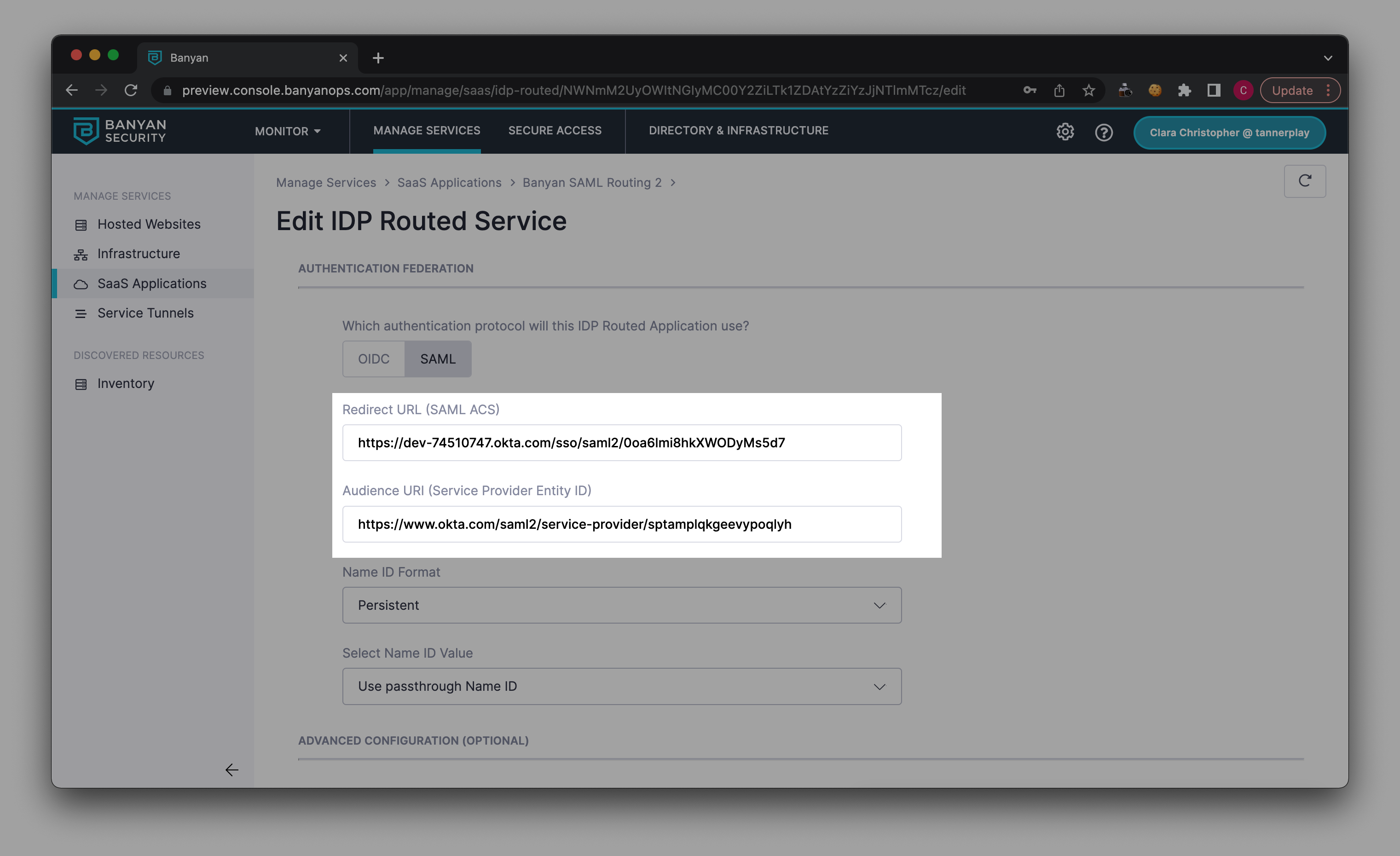 Step 3: Update the Redirect URL and Audience URI in your newly created SaaS app in Banyan