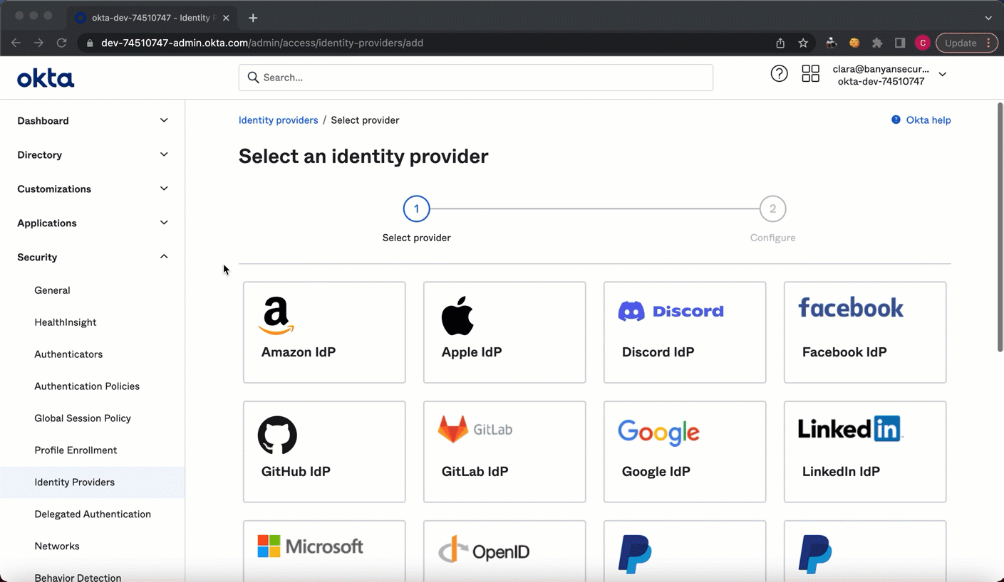 2.1 In your Okta admin account, navigate from Security > Identity Providers. Then, select Add identity provider.
