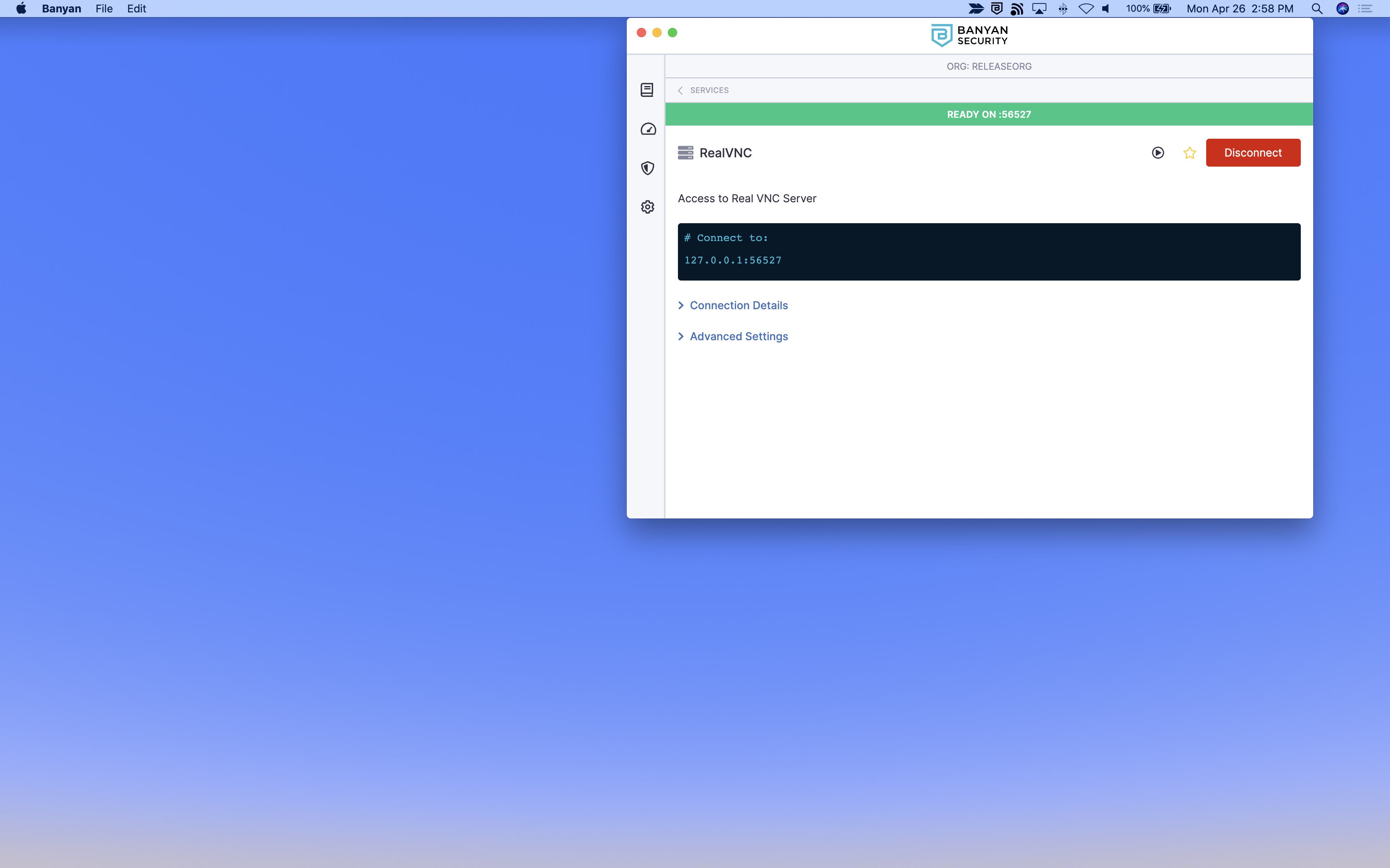 4.1 Launch the Banyan Desktop App, locate the hosted VNC server from the list of TCP Services, and then click Connect. A green status message appears.