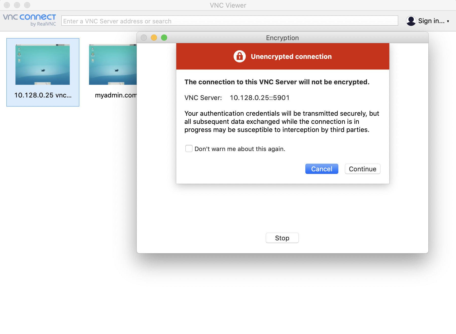 4.2 In your VNC Viewer, locate and then launch a new connection to the applicable VNC server.