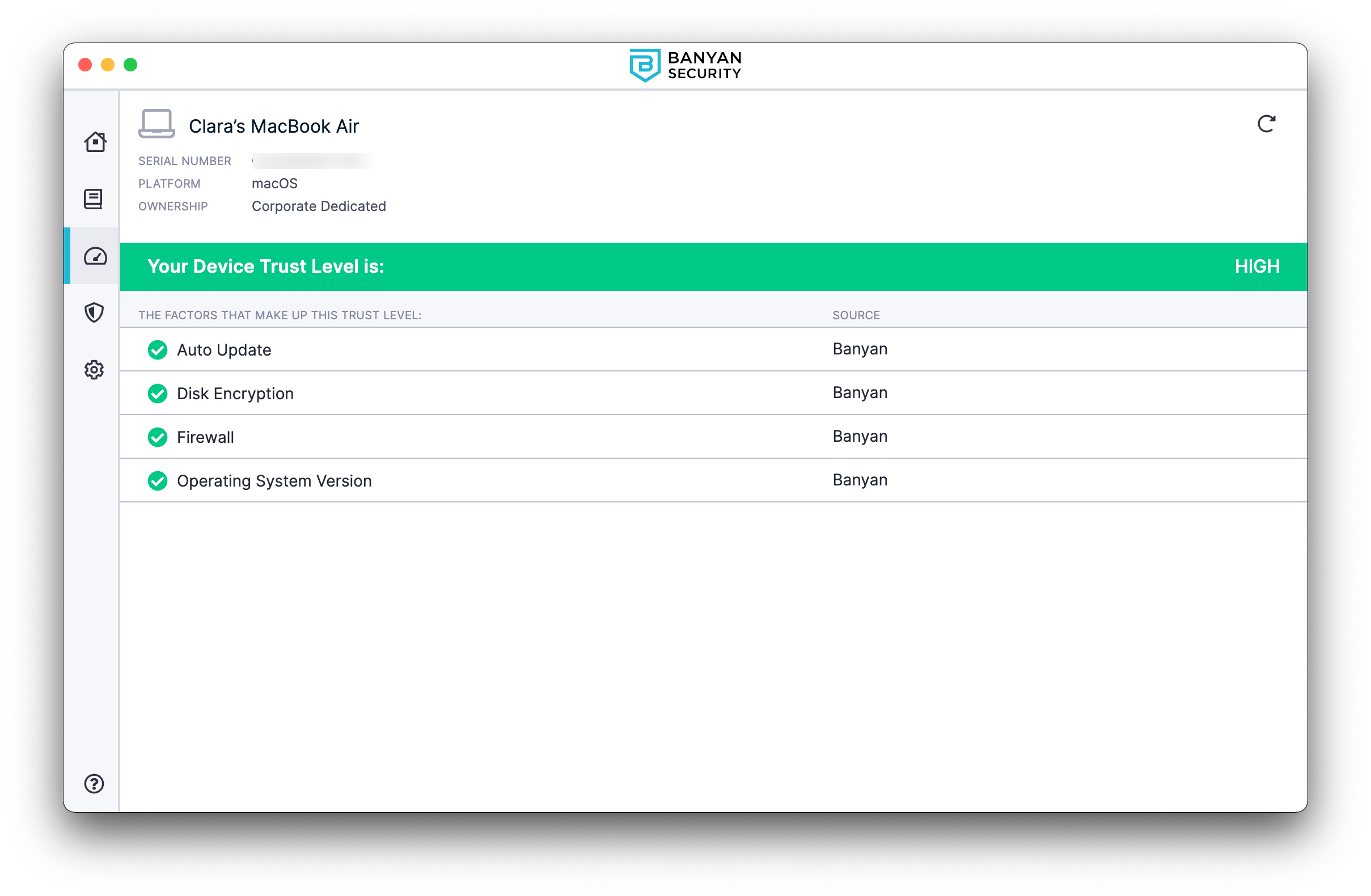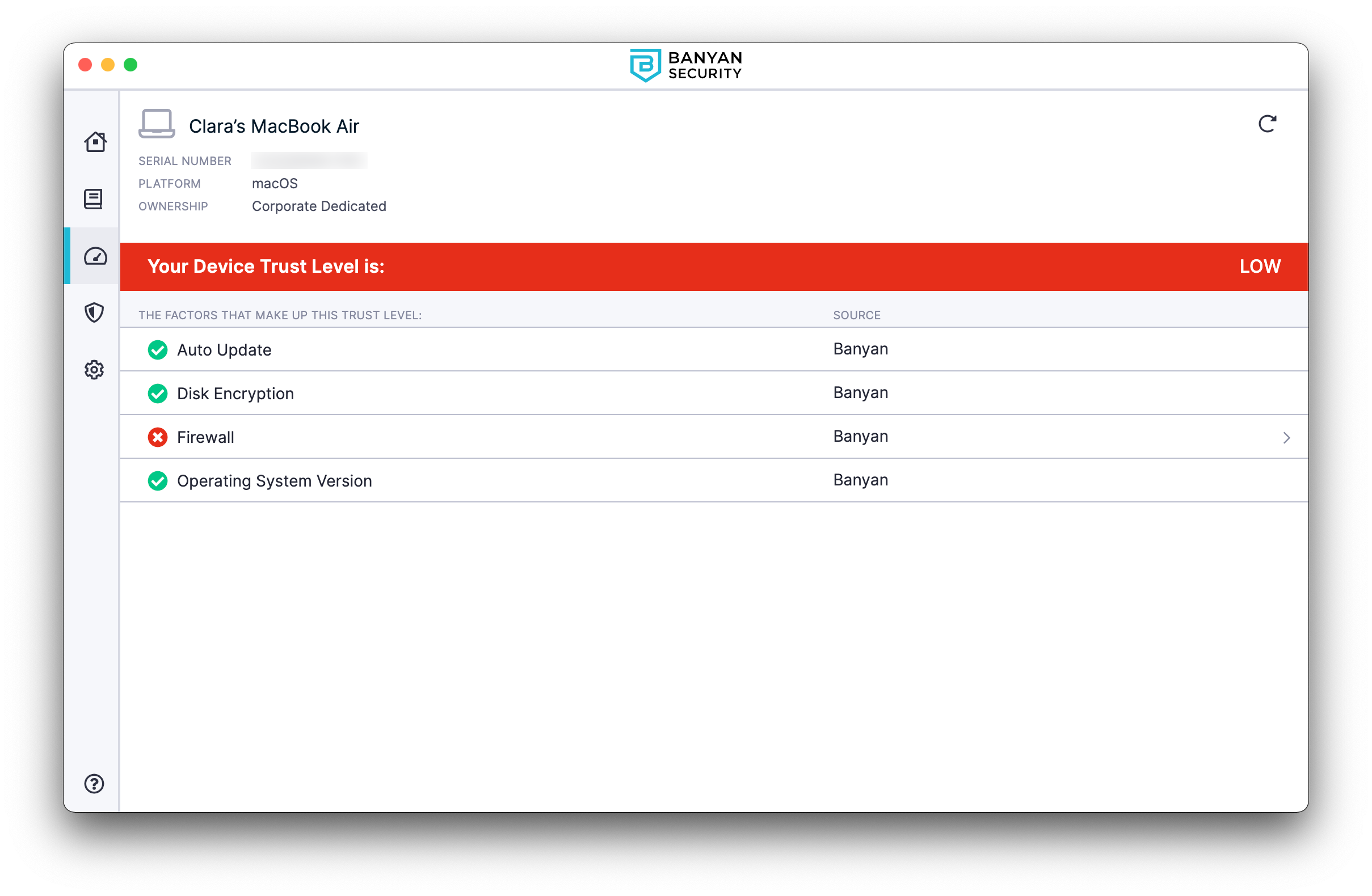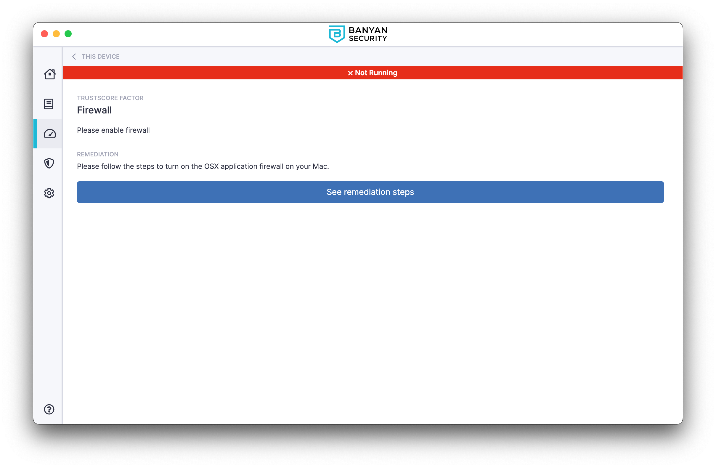 The desktop app displays each Trust Factor’s current status (i.e., enabled, running, up-to-date). The example below shows a macOS device having a disabled Firewall, which is required to access secured services.