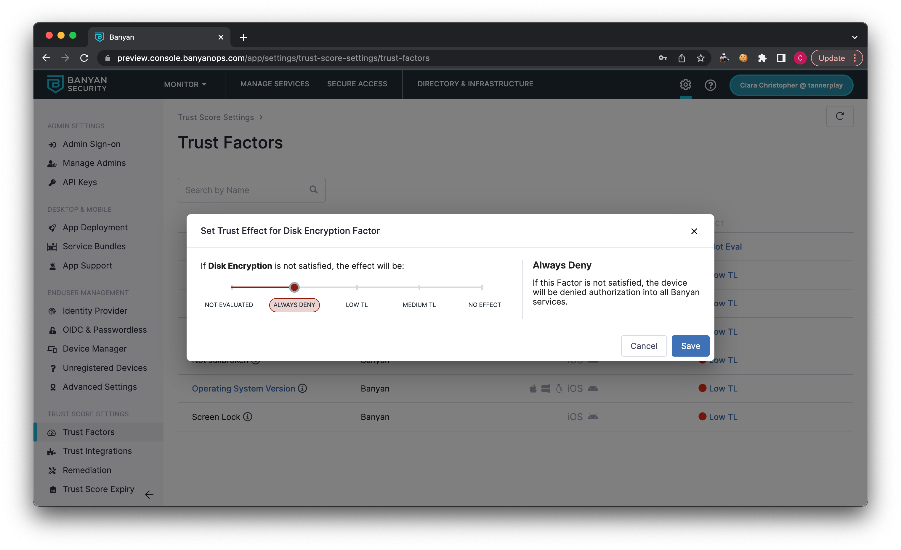 - If you require a Trust Factor to be mandatory, the recommendation is to set the Effect to Always Deny.
