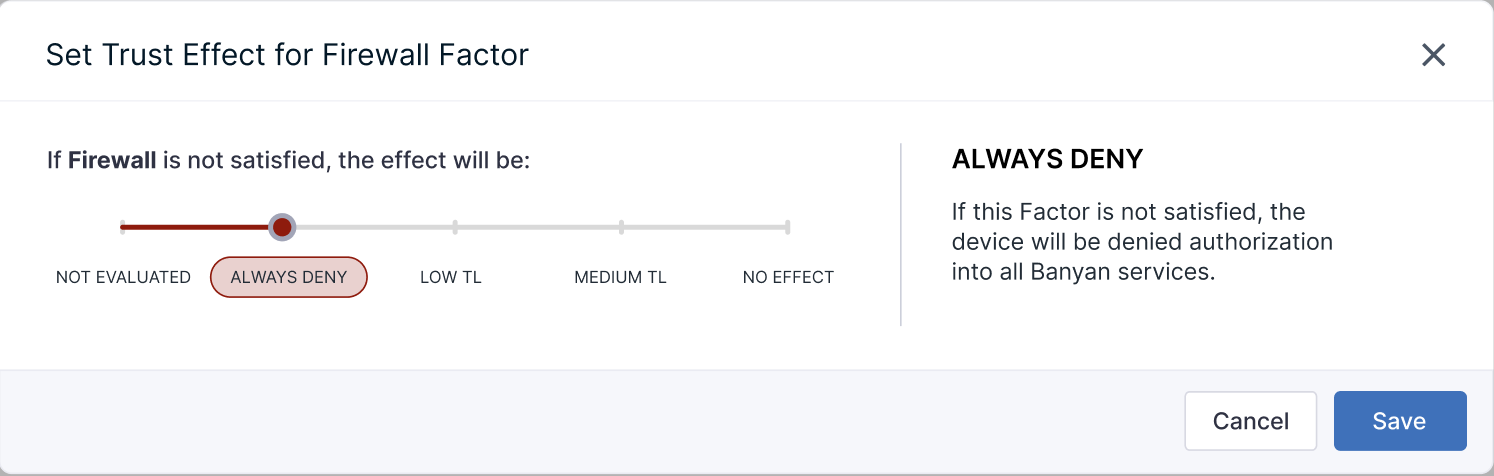 | No Effect | If this factor is not satisfied, it will have no effect on the device’s Trust Level, but will be displayed in the app. This is primarily used for testing purposes. |