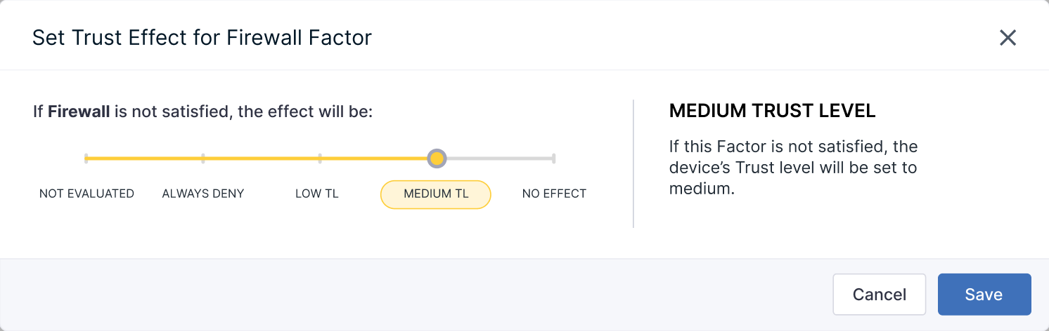 Example: An admin sets a Low Trust Level as the Trust Effect for the Firewall Trust Factor. That means that if a firewall is not enabled on the device, the device’s Trust Level will drop from its typical healthy state, High, to Low. But if the firewall is enabled on the device, the Trust Factor will be satisfied, and there will be no negative impact on the device’s Trust Level (i.e., the device’s Trust Level should remain High).