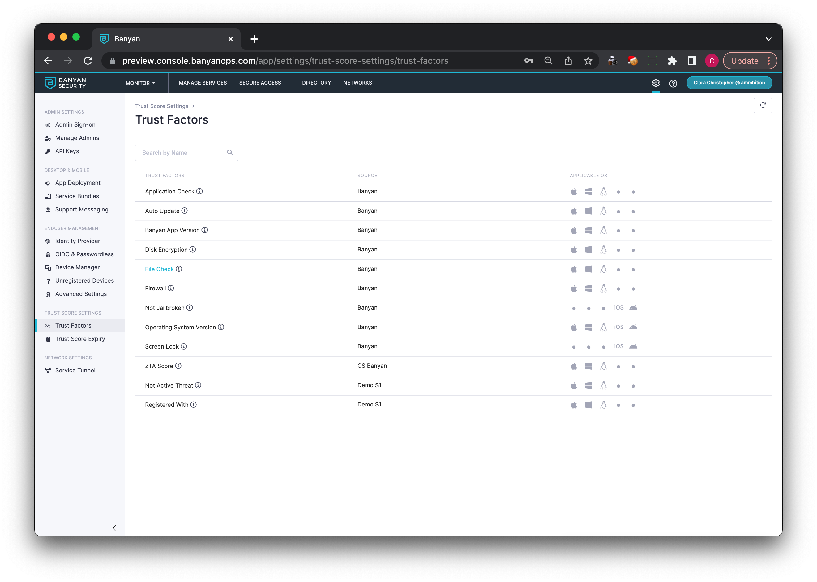 A Trust Factor is a feature that helps determine a device’s security posture: it is an attribute that filters into Cloud Secure Edge’s Trust Scoring calculation - a quantitative evaluation of confidence that the device at hand is secure.