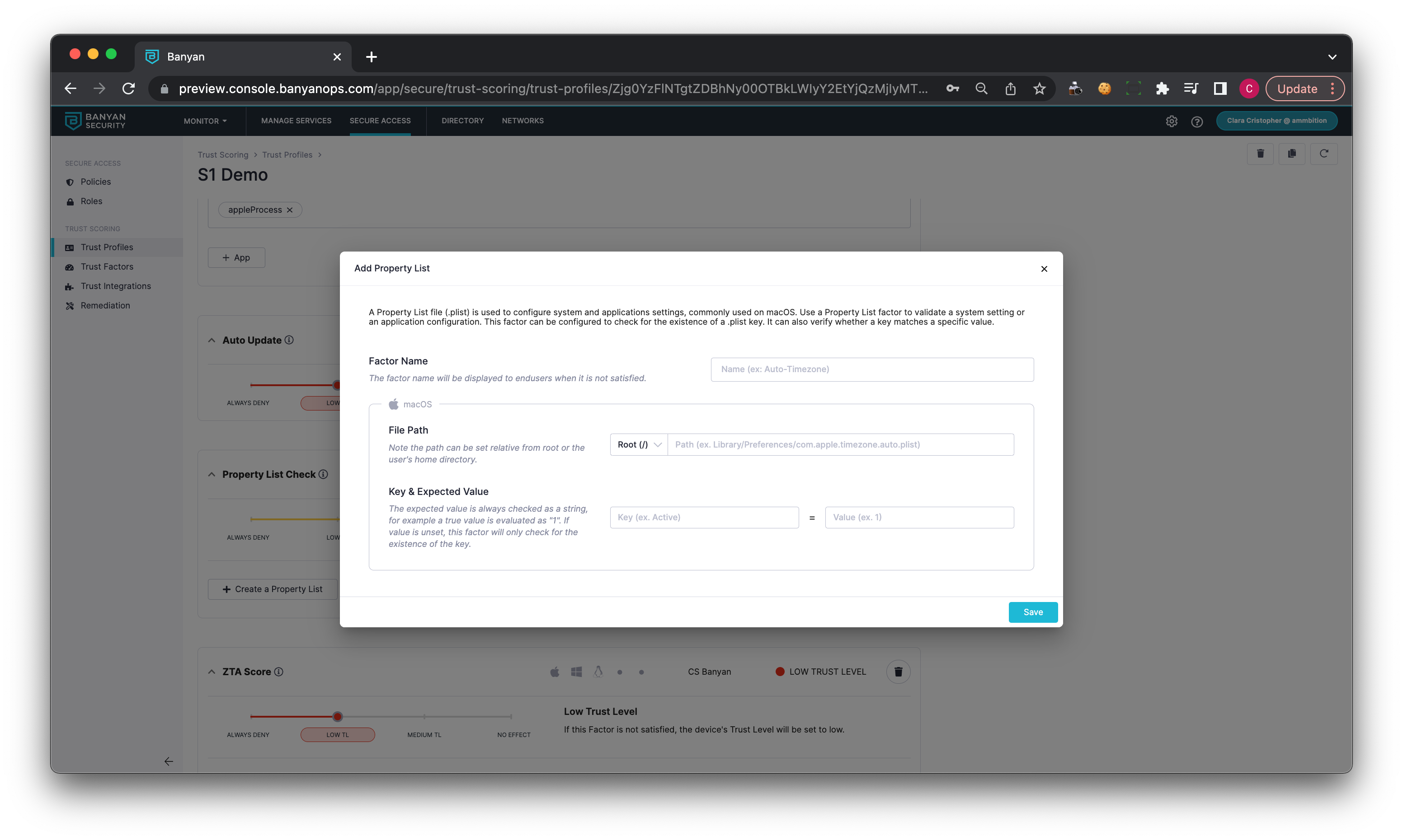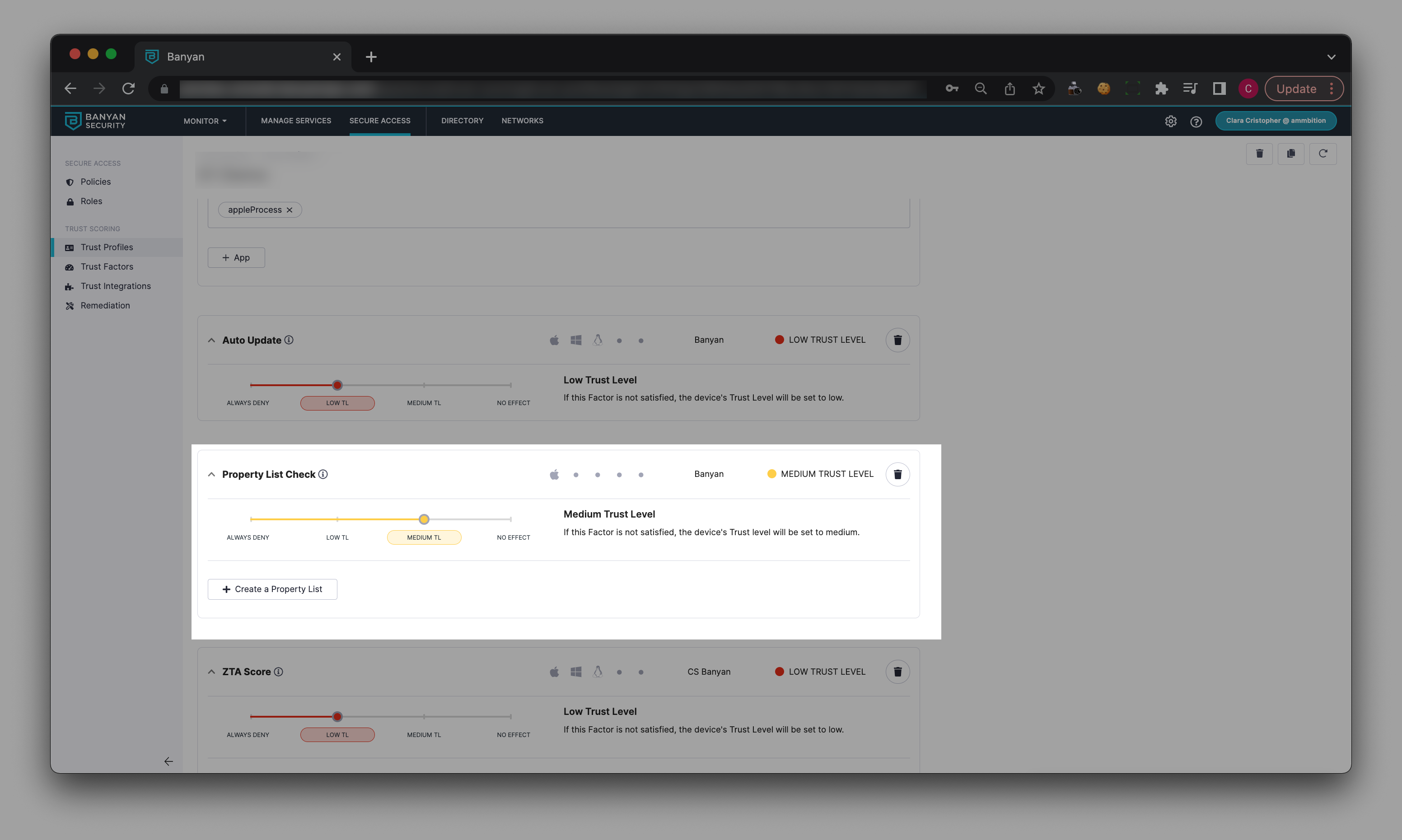 Under the Trust Factors tab, select + Add Trust Factors if creating a new Trust Profile; select Edit and then +Add Trust Factors if adding new Trust Factors to an existing Trust Profile. Select Property List Check.