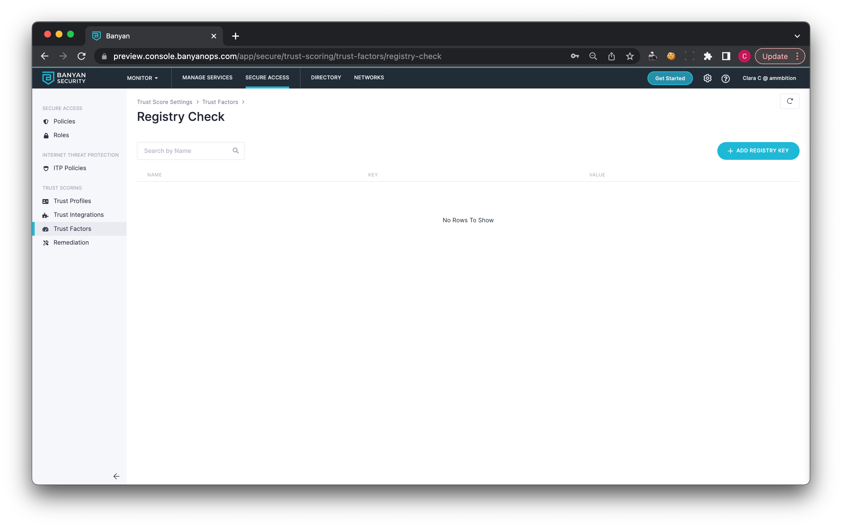 1. In the Command Center, navigate from Trust > Profiles. Then, select the Registry Key Check Trust Factor on an existing Trust Profile, and select + Add Registry Key.