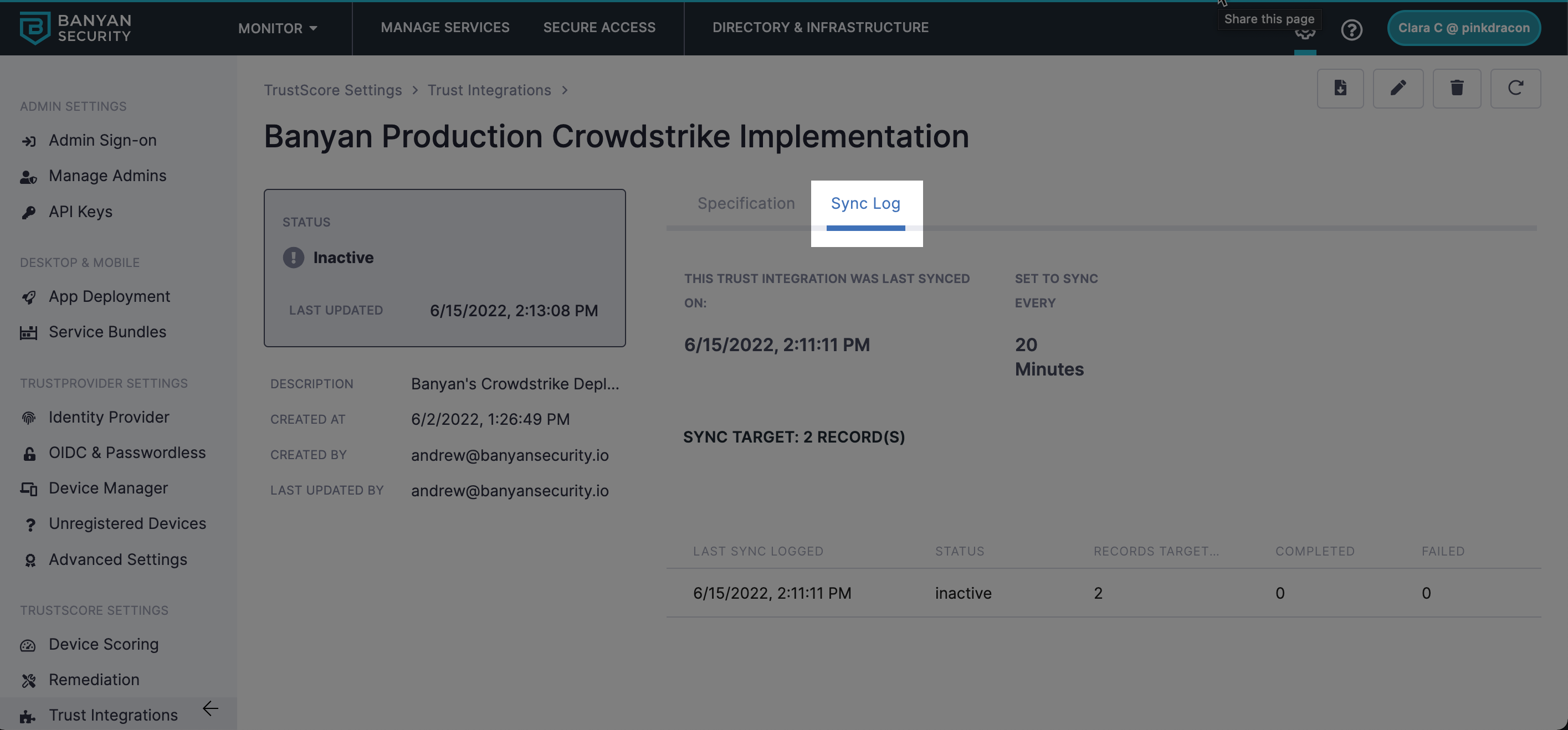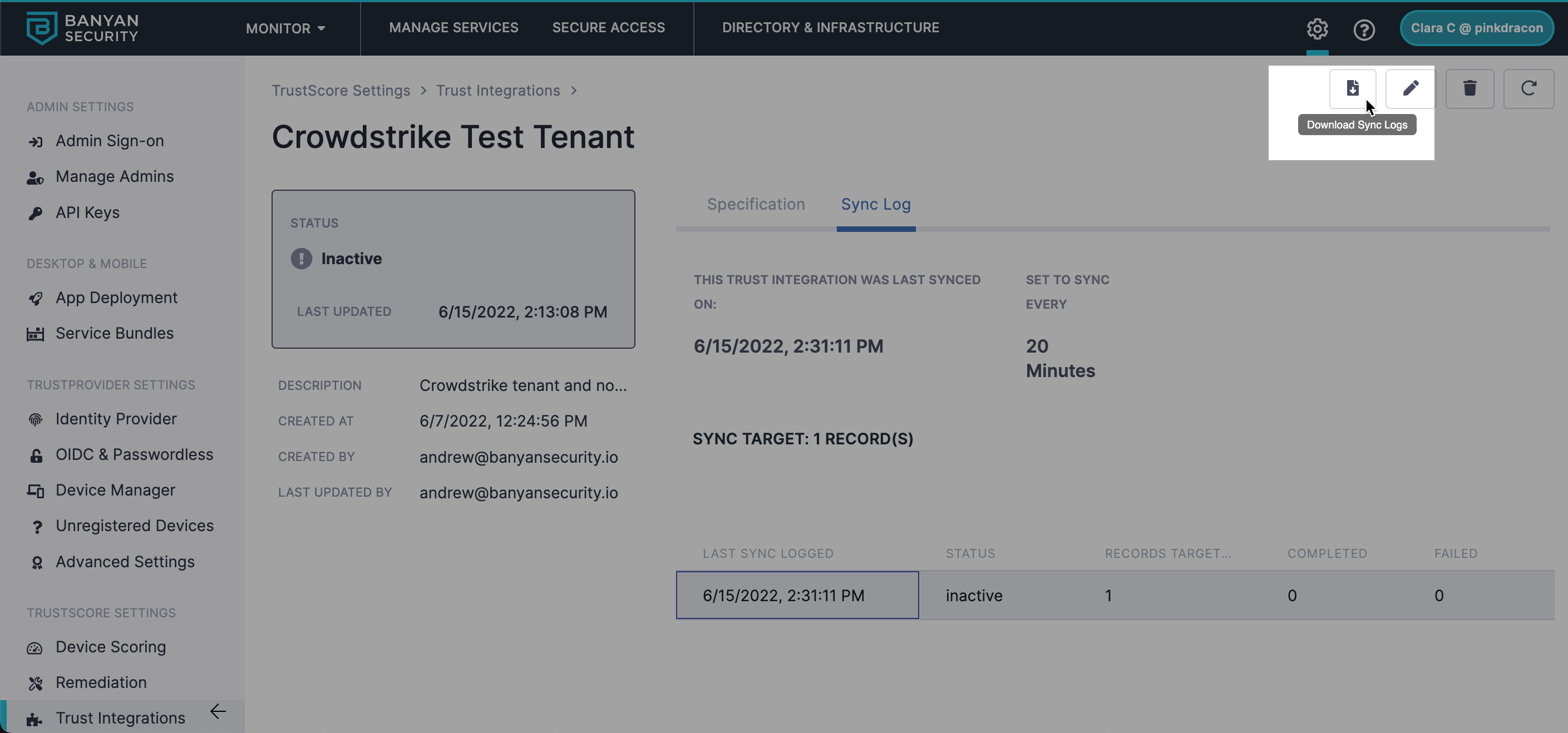 (1) On the Trust Integration page, select the name of the integration requested to obtain sync log information from.