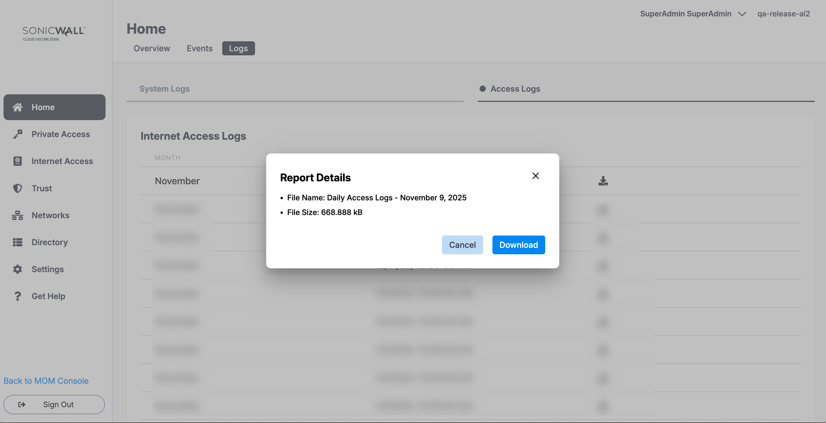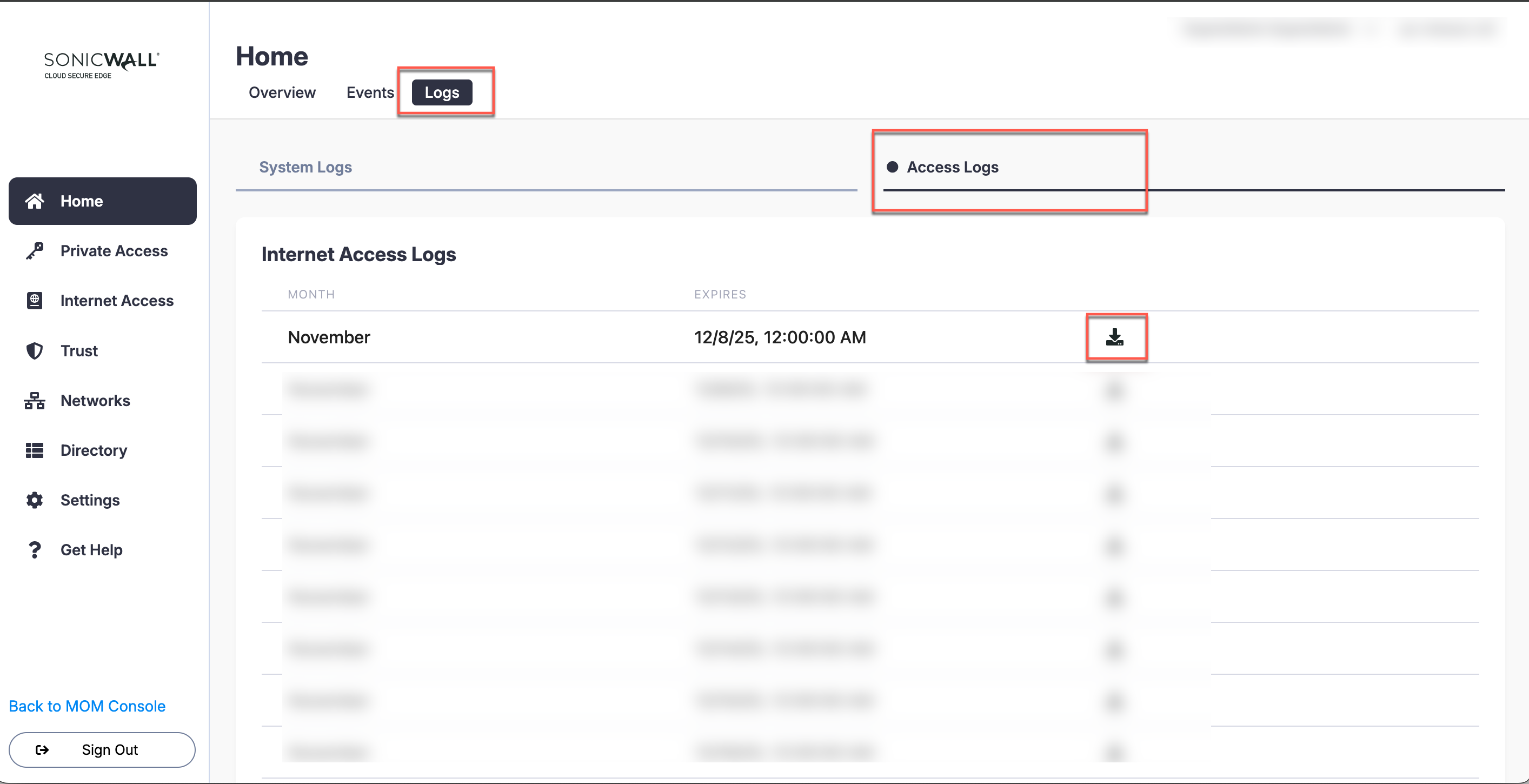 The Internet Access Logs display access activity of users in your org by month. Each Access Log entry contains a downloadable file (generated by month) that details all of the blocked and allowed requests evaluated by Cloud Secure Edge’s secure web gateway (SWG) agent.