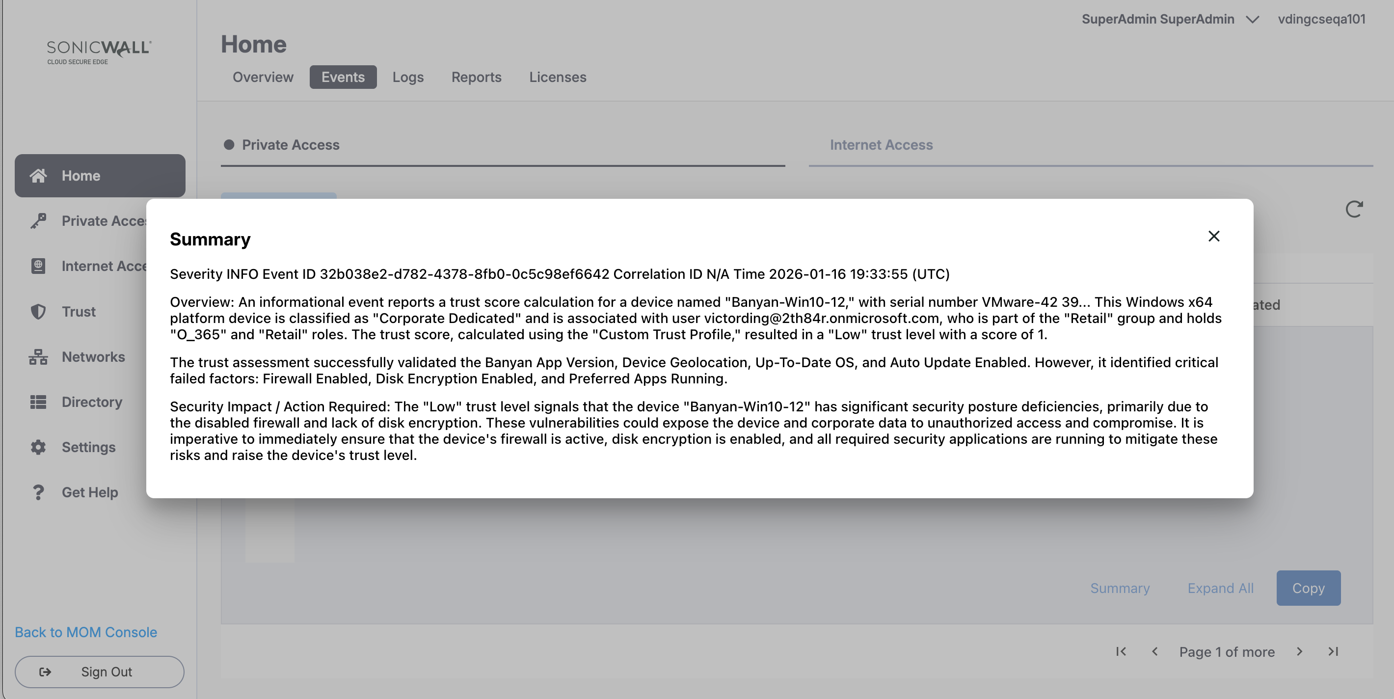 Filter and review security events associated with end-user activity in your Cloud Secure Edge organization