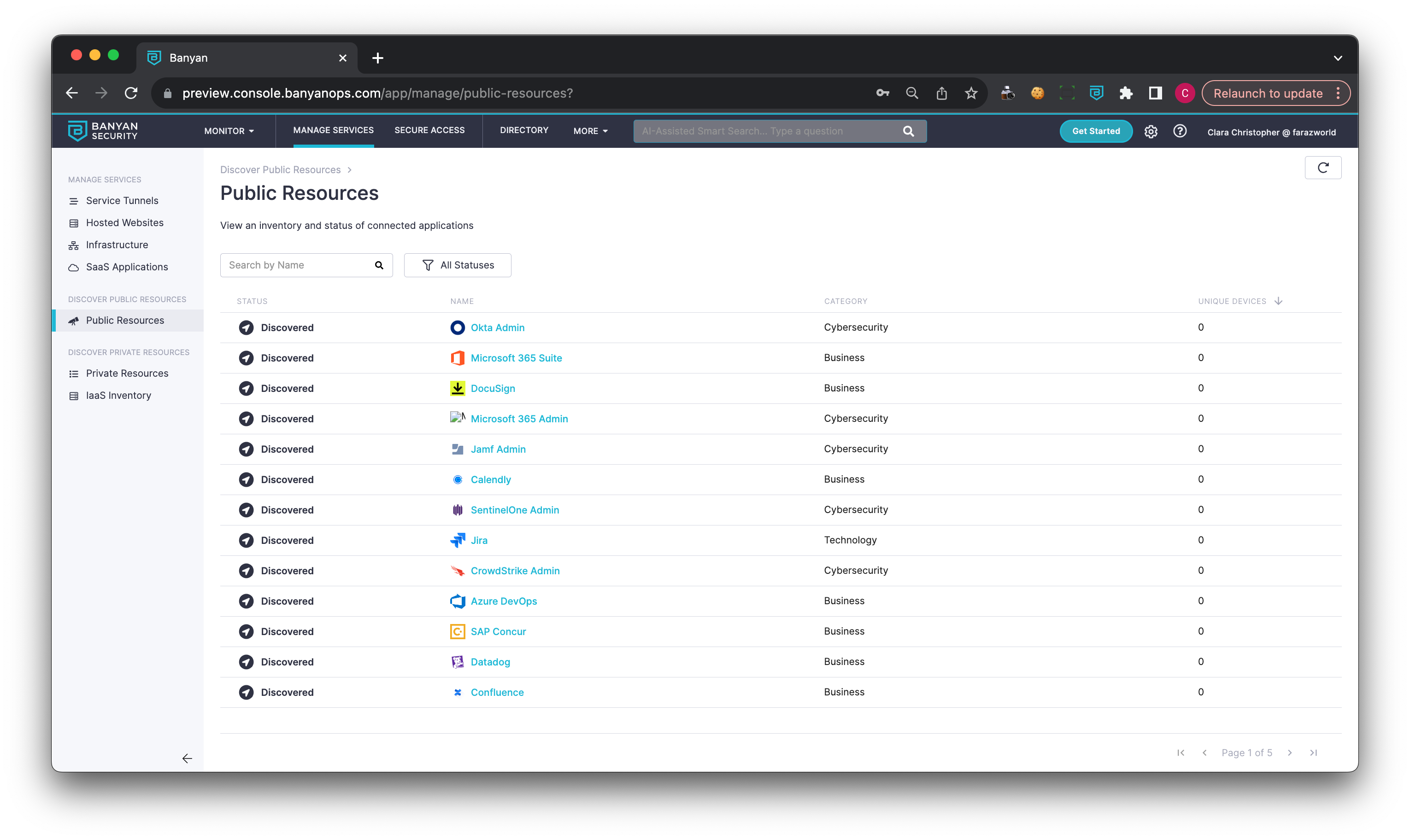 App Discovery is a new feature that provides admins visibility by recording end users’ DNS requests, mapping them back to Cloud Secure Edge’s (CSE) database of public apps, and providing the admin a list of all the public applications used by employees who have the desktop app installed. CSE leverages existing ITP architecture to deliver this capability.