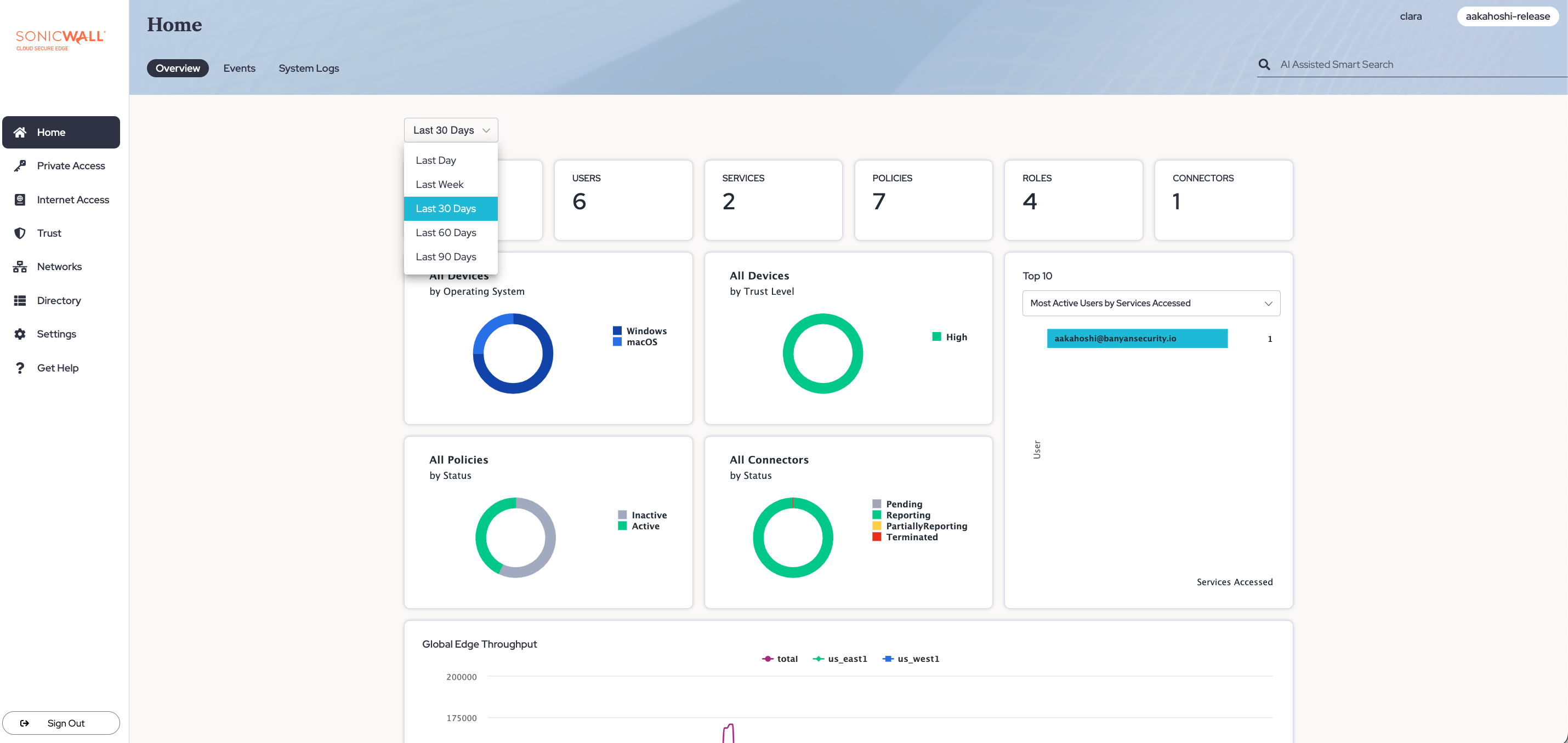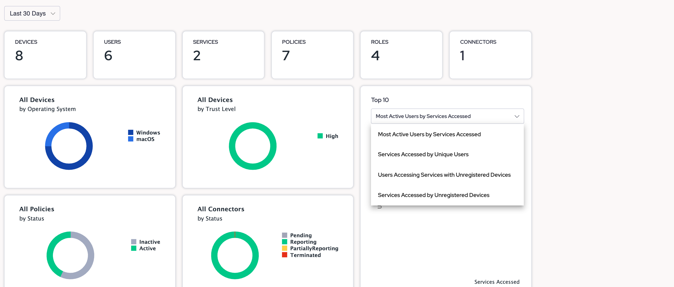 - Access activity - Total counts and breakdowns of your devices, users, services, policies, roles, and Access Tiers.