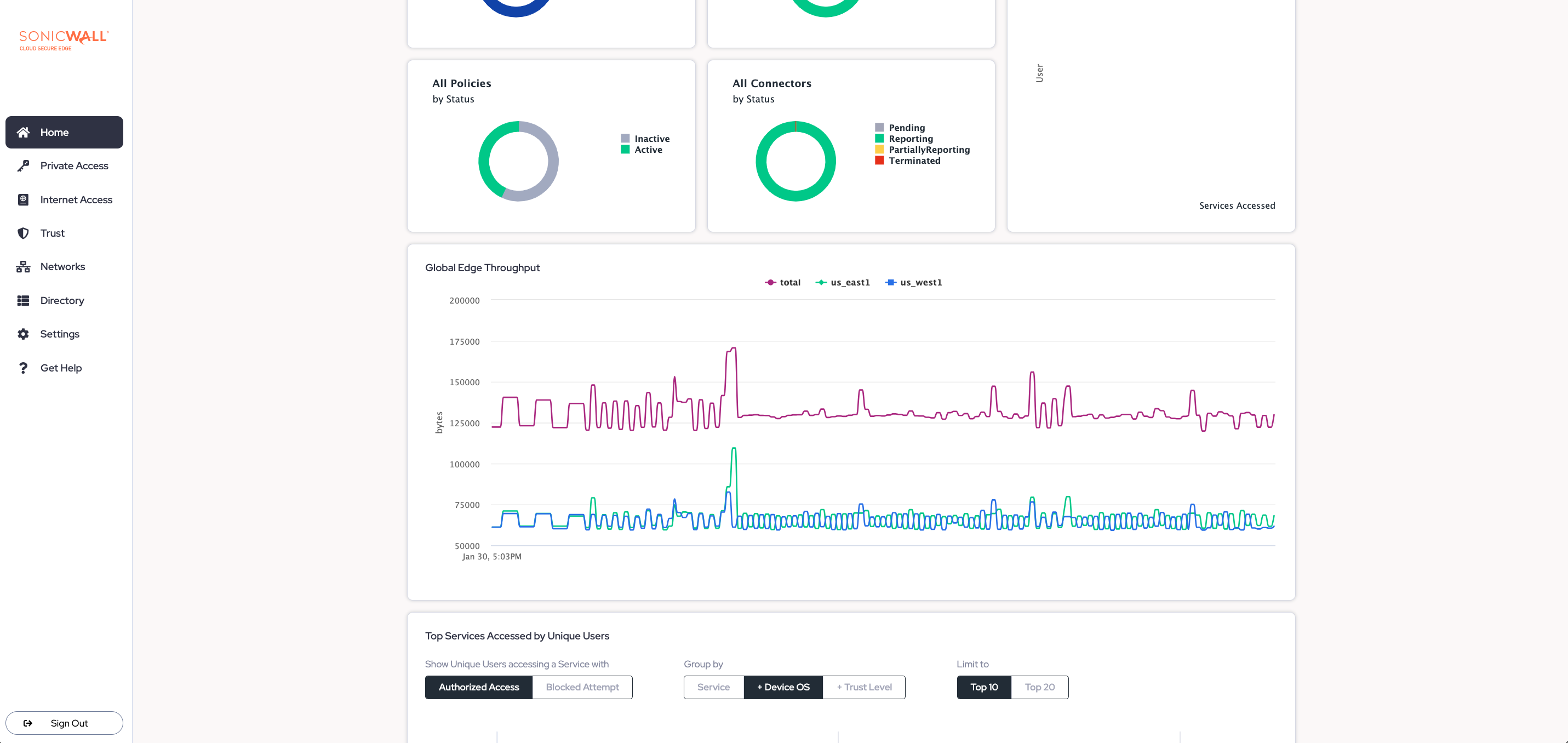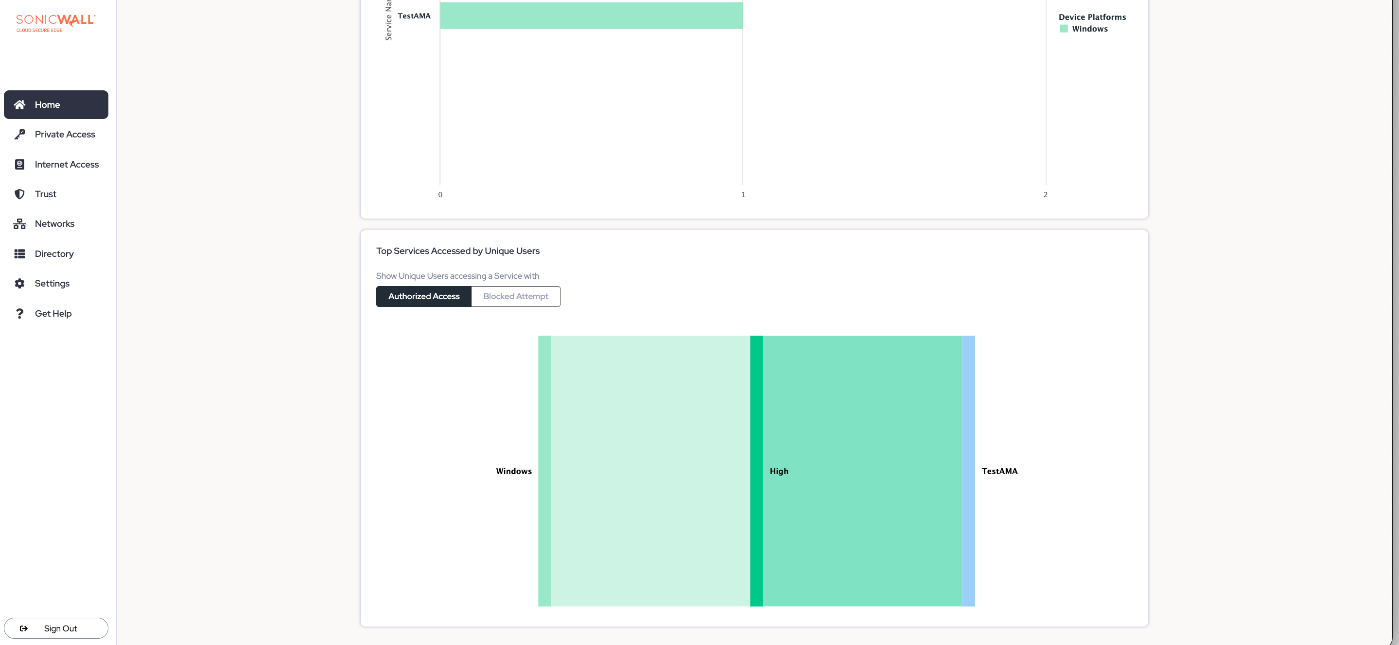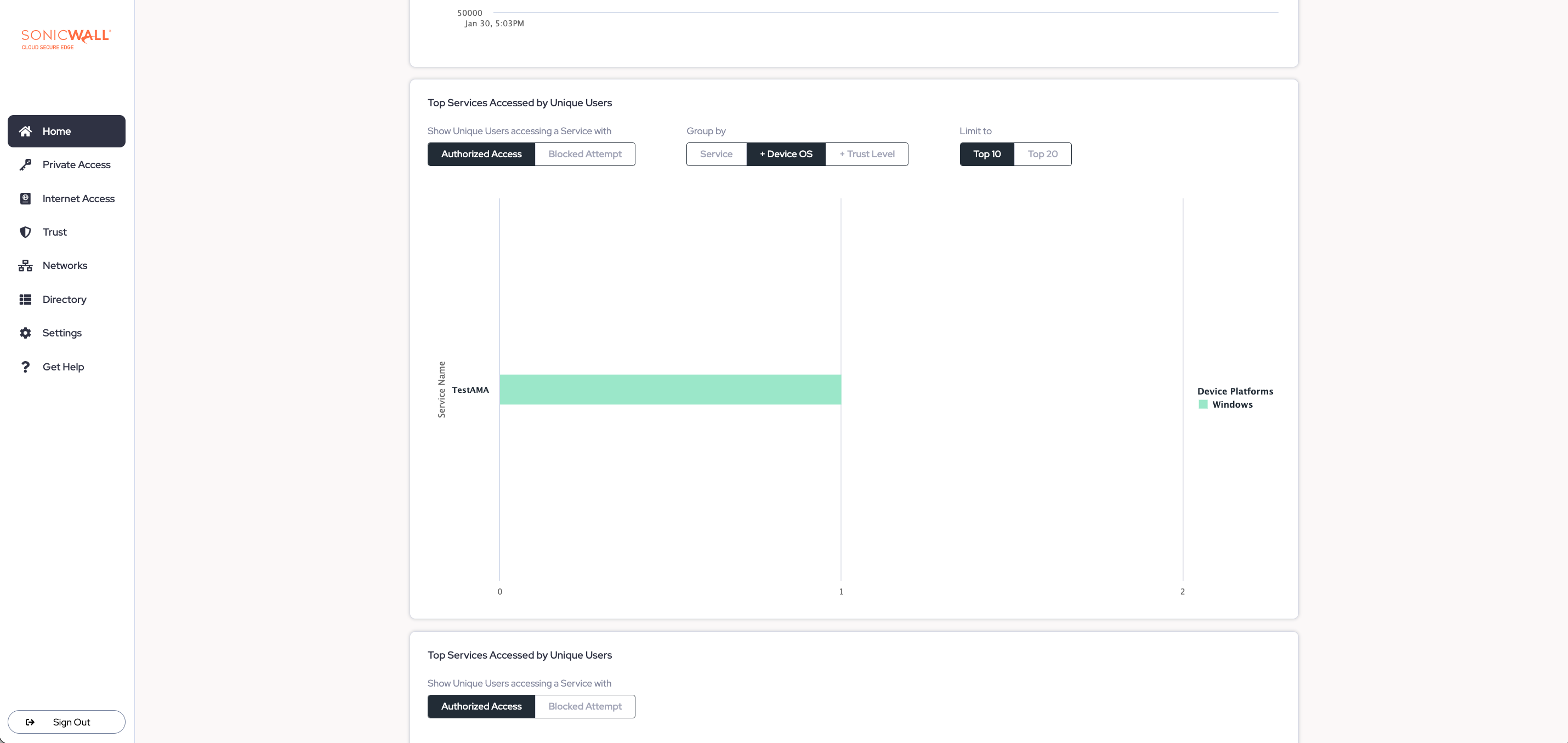 The Top Services Accessed by Unique Users graph displays counts of unique users making authorized and blocked access attempts to individual services. Then, drill down deeper into the data by Device Operating System and TrustLevel.