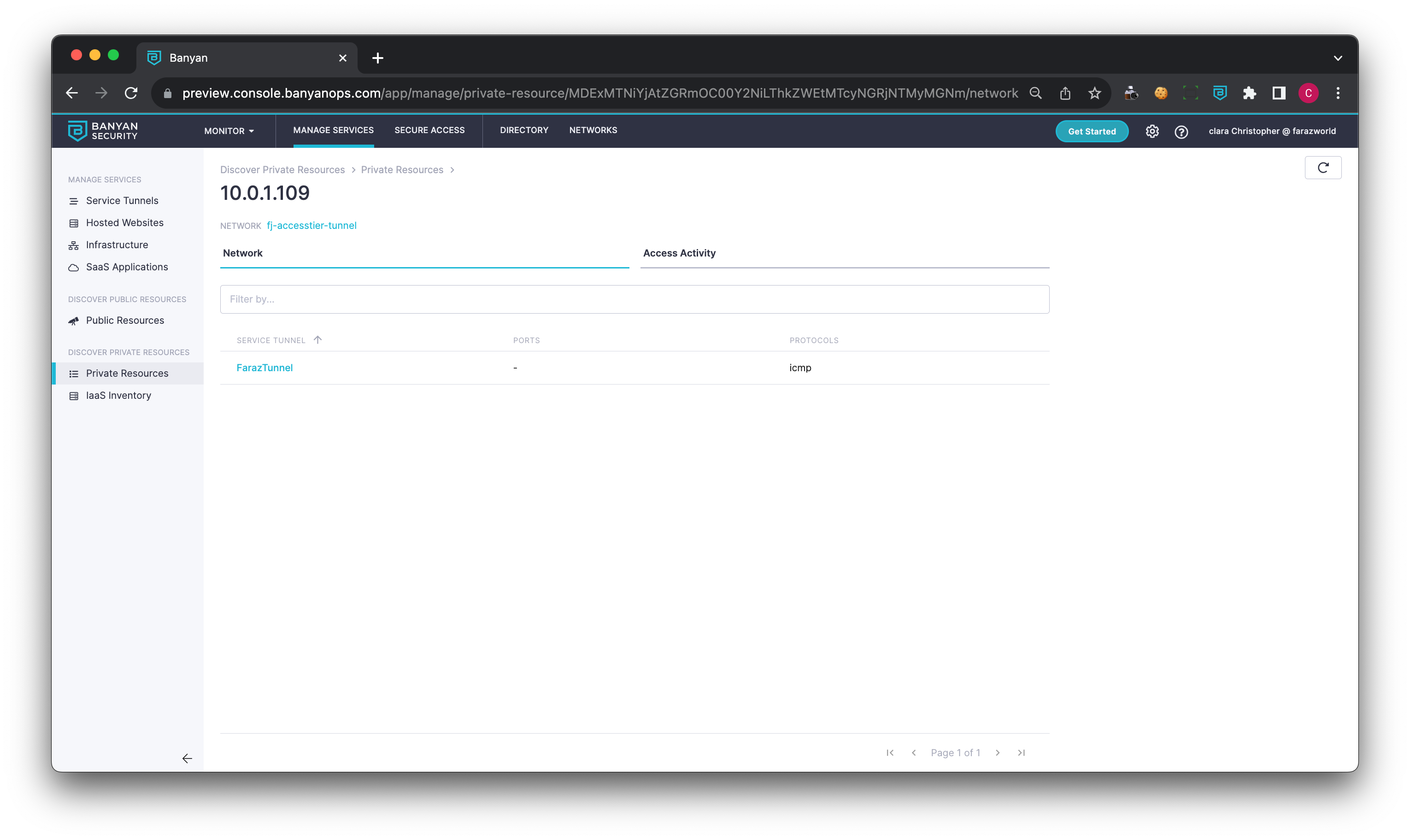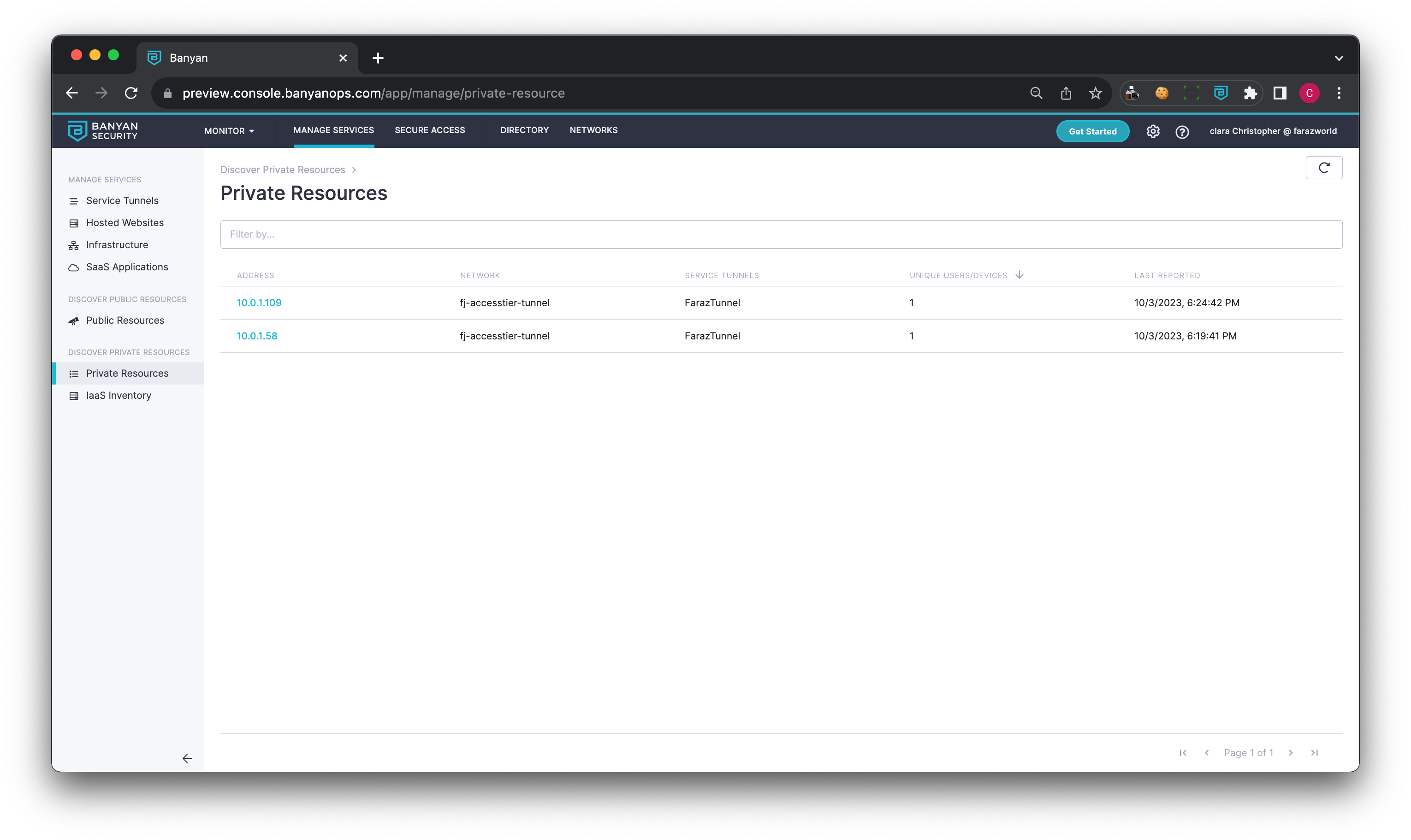 The Private Resources list can be found under Private Access > Discovery. The Private Resources list contains unique records showing access attempts to an enabled Service Tunnel. Each unique record consists of a domain name or an IP address, as well as a port number.