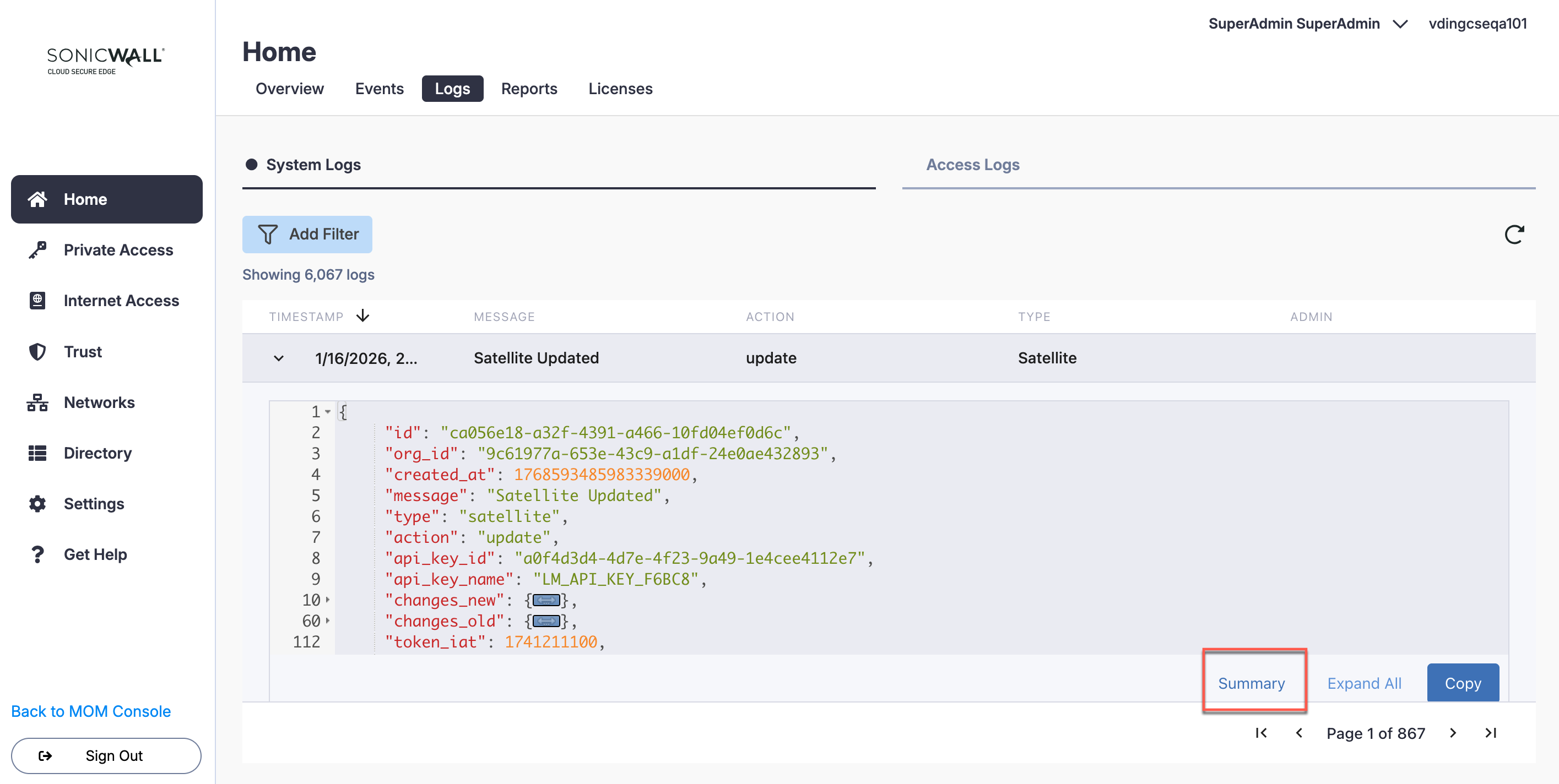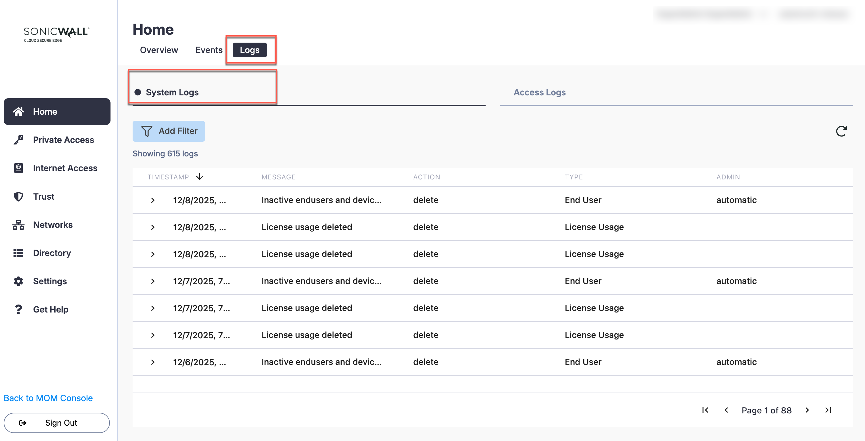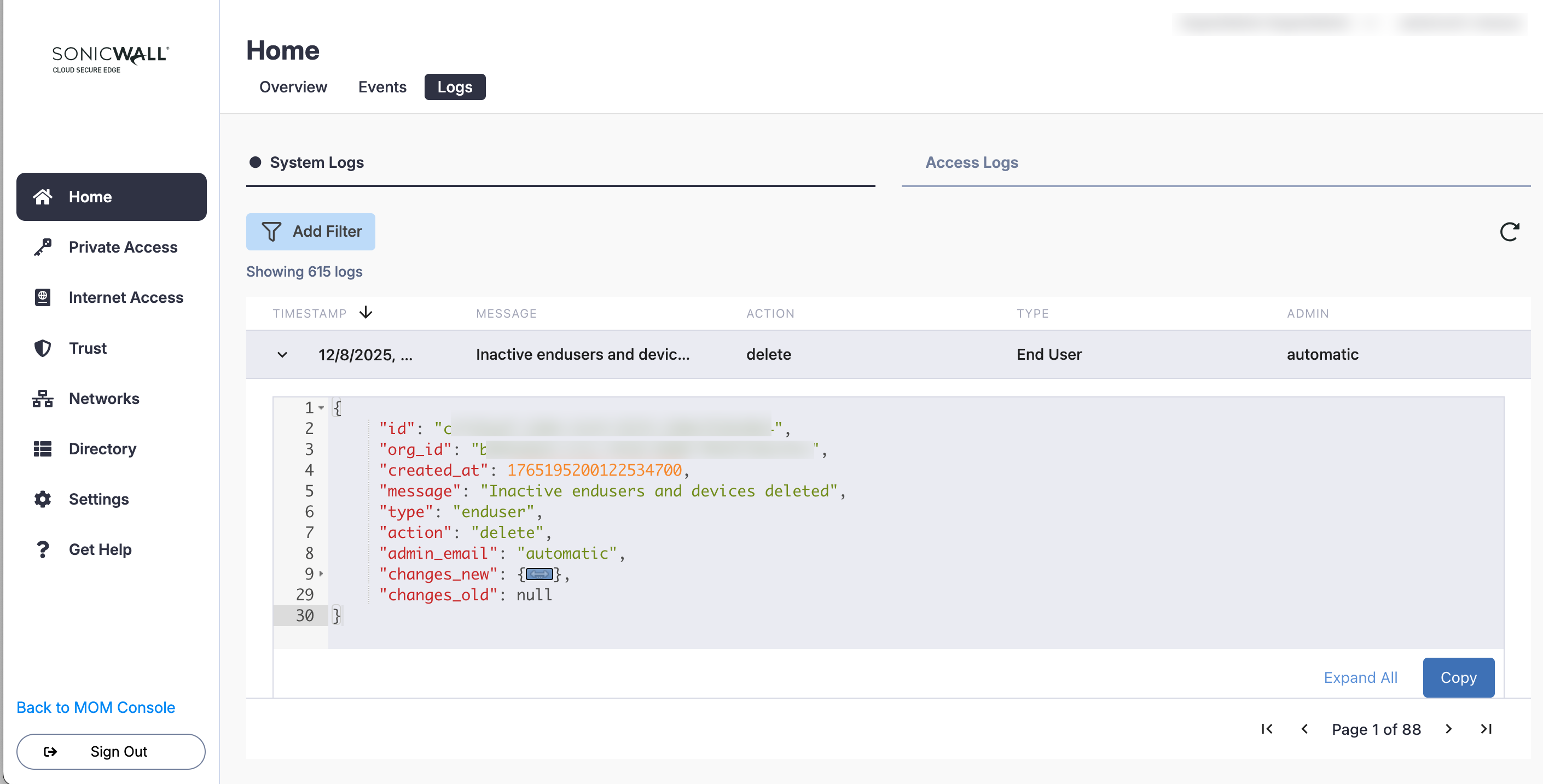 Review detailed logs of administrator activity in your Cloud Secure Edge organization